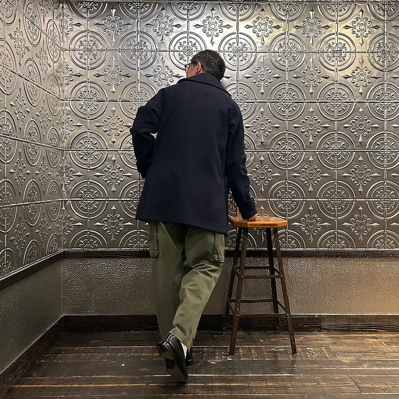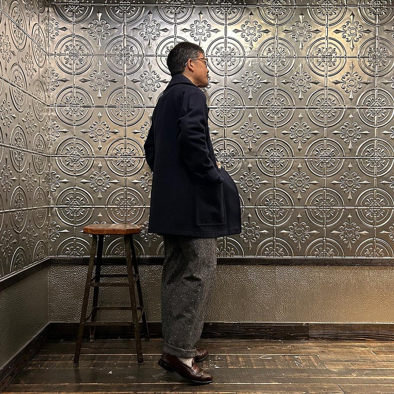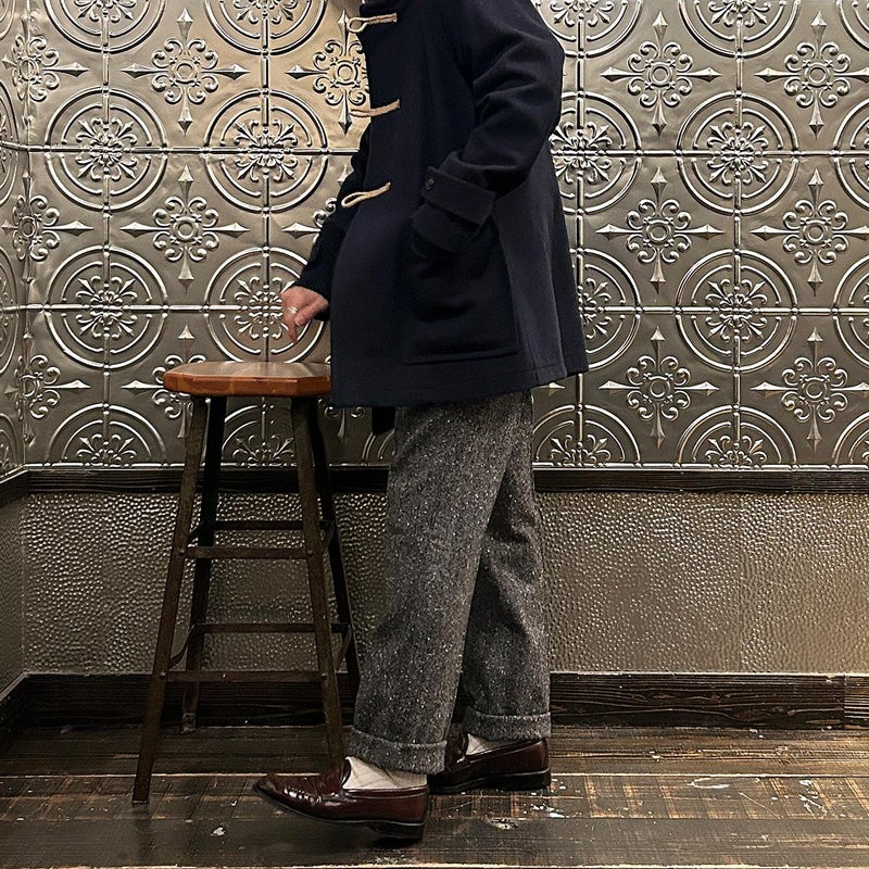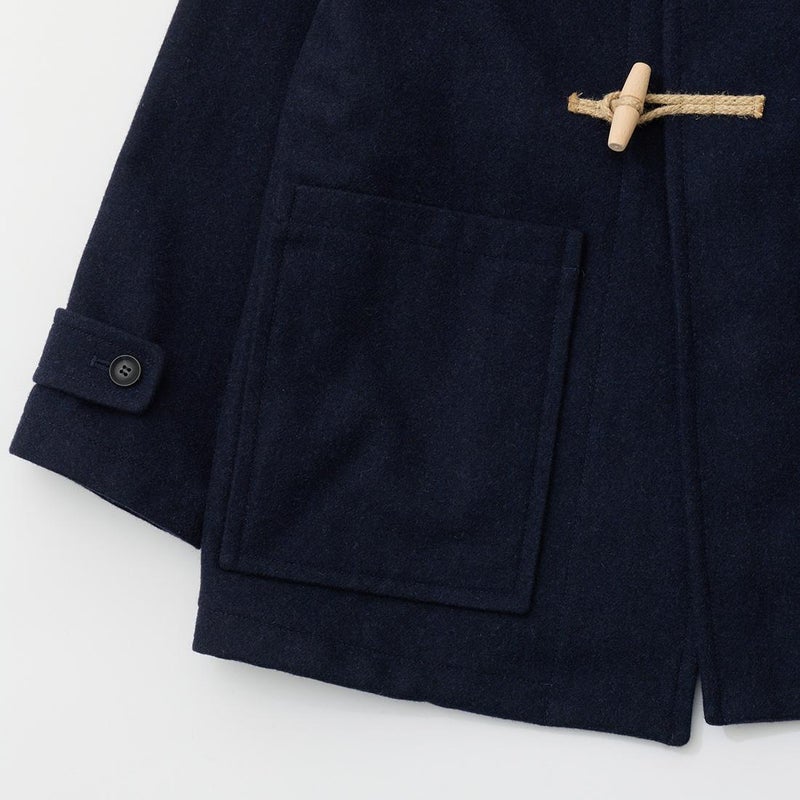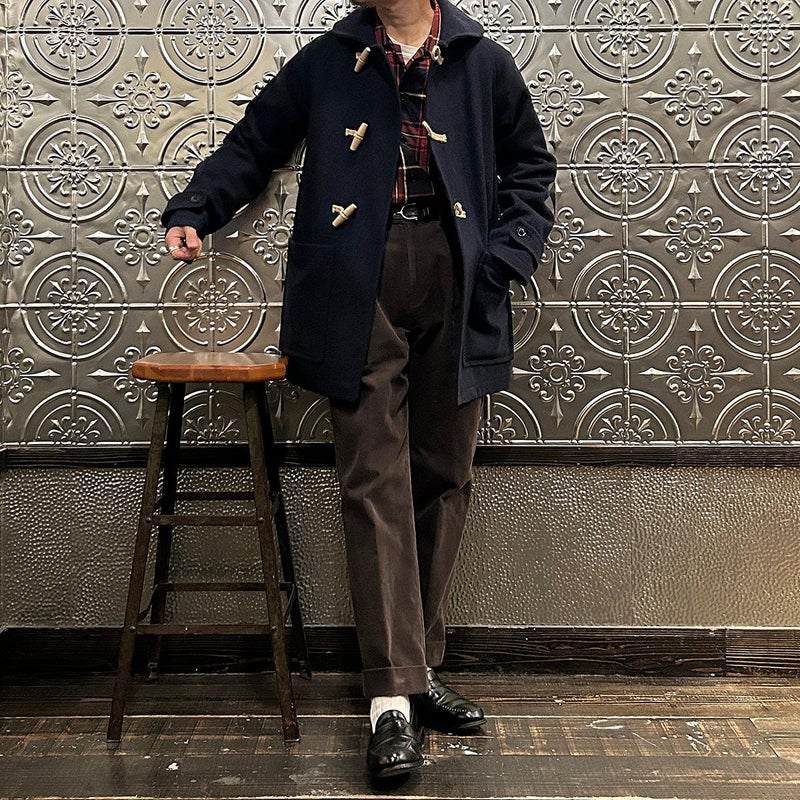 LONDON TRADITION(ロンドントラディション)の RAGLAN SLEEVE DUFFLE COAT。 ライトウェイトのメルトンウール一重仕立て(裏地なし)のダッフルコート。 襟元はチンストラップ付のショールカラー。 素朴な麻紐と白木トグル。 ダッフルコートでは珍しいラグランスリーブ仕様。腰部分の大きめのパッチポケット。 お尻隠れるくらいのミディアムレングス。 この手のウールダッフルコートにしては着始めから体に馴染みやすく着易いのが特徴。