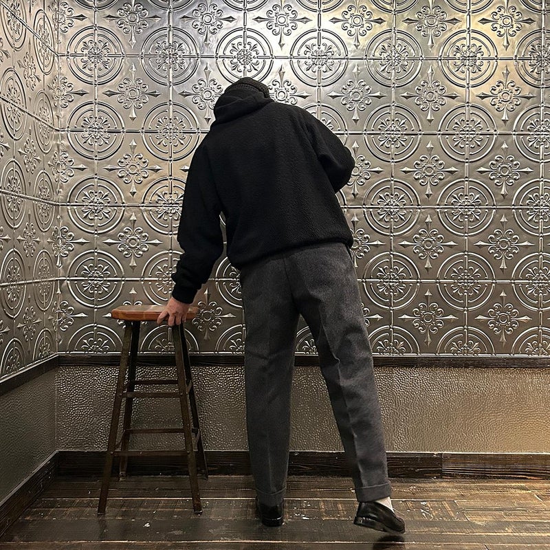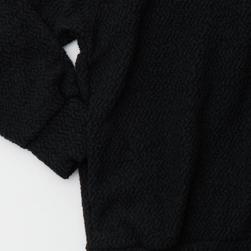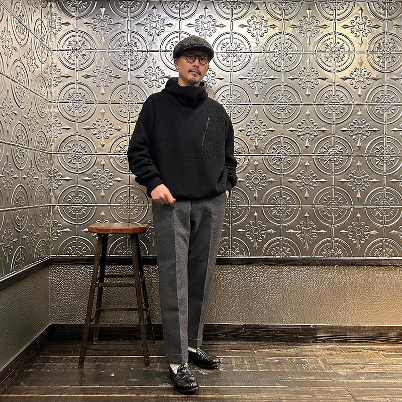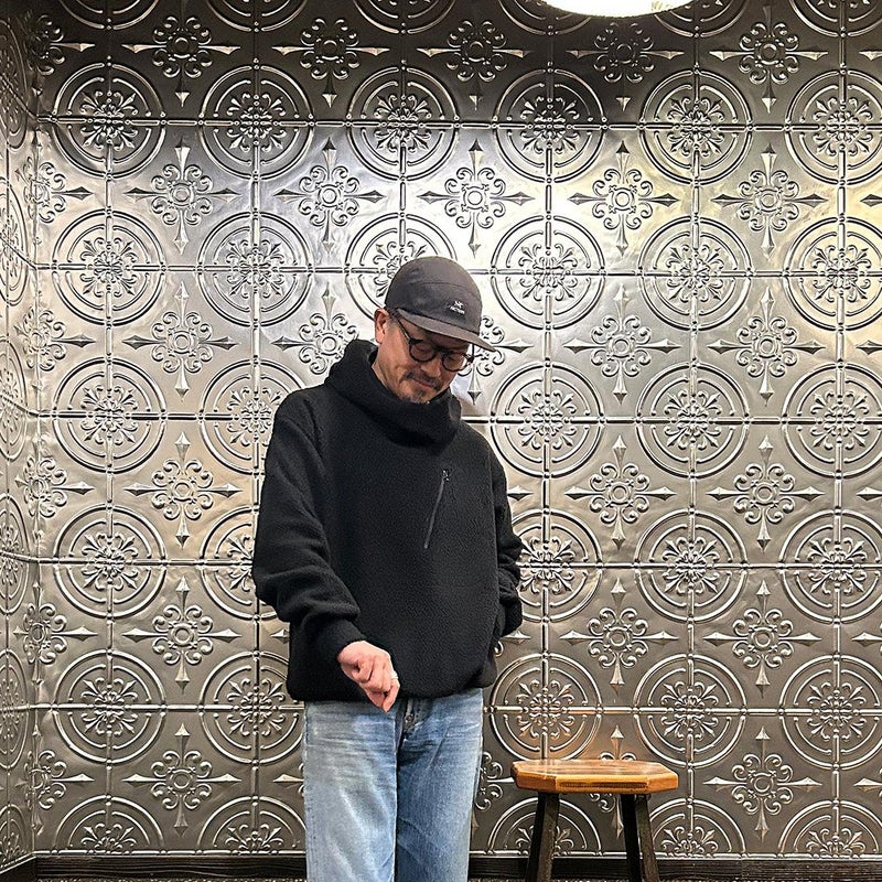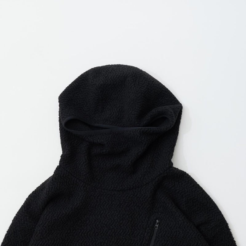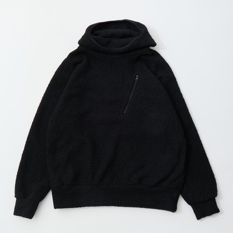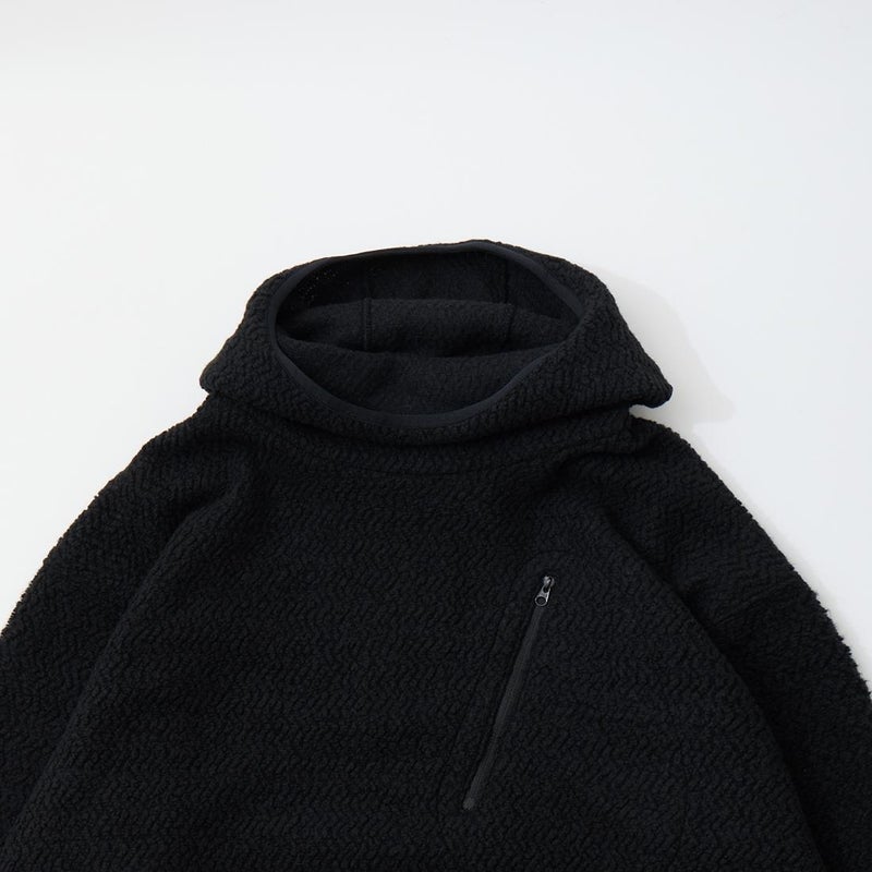 MODMNT(モドメント)のHOODED TURTLE POPOVER。ウールと化繊混のフリースを使用したフーデッドタートルポップオーバー。ウールは150年近くリサイクルウールを扱うイタリアのCALAMAI社のサステナブルな糸。それにマイクロ化繊糸を混紡してエアリーなウェーブフリースに編み立てた生地。軽くて暖かく、防臭性にも優れた生地。タートルネックのように首元を包むバラクラバ型フード。左胸のジップポケット。腰上の左右にハンドポケットも装備。ボリューム感がありながらも軽く快適な着心地の1着。