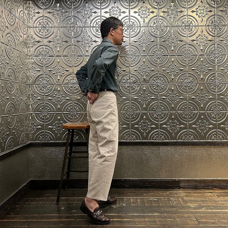 170センチ68キロで通常31から32インチのサイズを選びますが、こちらは「46」で丁度良いサイズです。ウエストは若干ゆとりはありますが、シャツをインして穿くことを考えると丁度良いです。腰回り、太腿はゆとりがあり膝から裾に向かって緩やかにテーパードが効いた絶妙なバランスのシルエット。