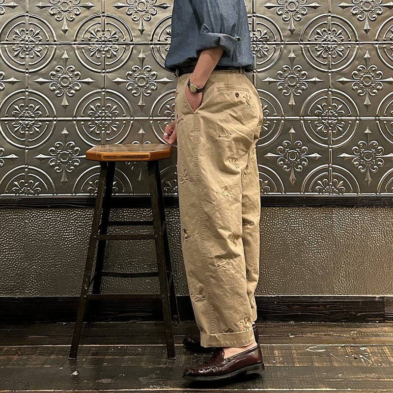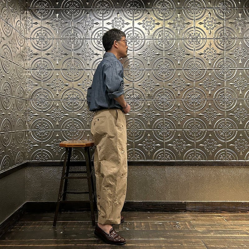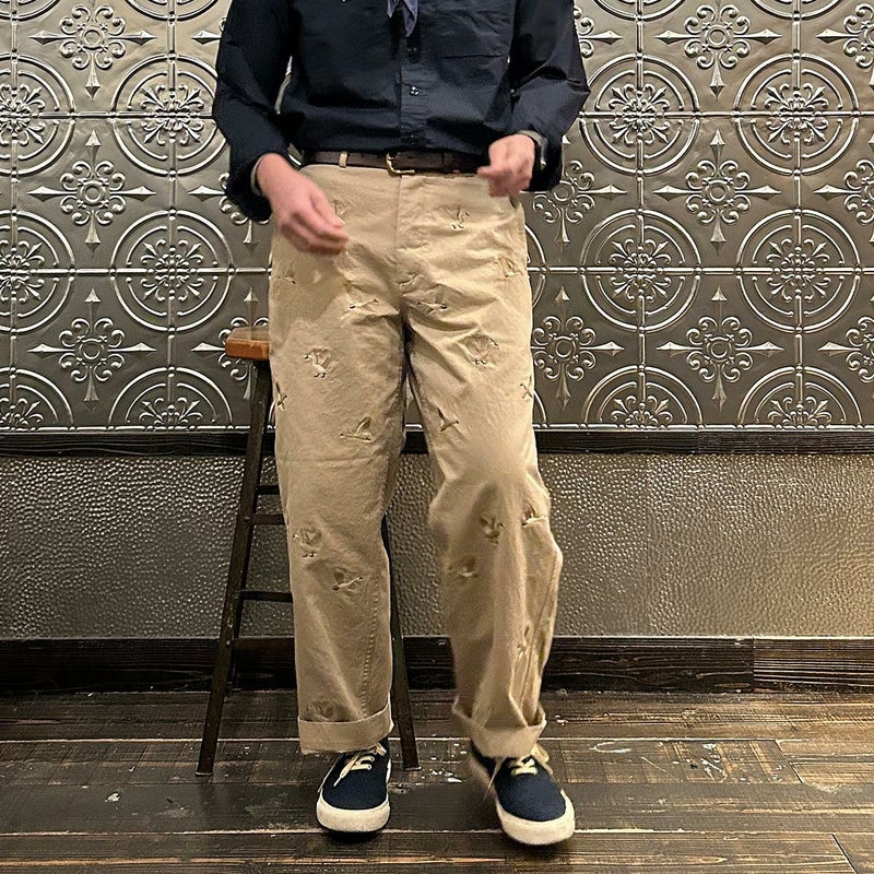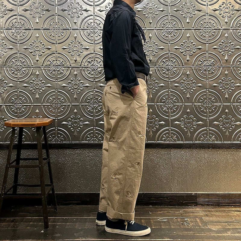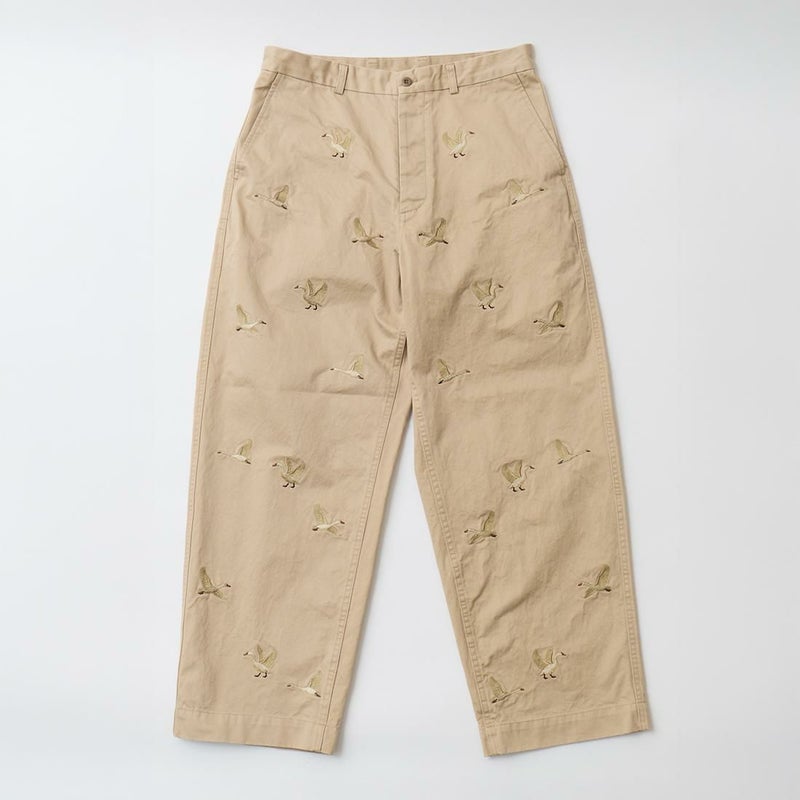 国内ブランドD.C. WHITE(ディーシーホワイト)のVINTAGE CHINO PANTS。ウェストポイント素材を使用したヴィンテージライクなチノパン。前立てはボタンフライ。左右にスラッシュポケット。バックの左右に両玉縁ポケット。ほぼ絞りのない太めのシルエット。刺繍のモチーフは白鳥。刺繍を単調な並びではなく、生地の段階で製品のパンツになった時のバランスを考え配置。ウエストポイントの経年変化も楽しみな1本。