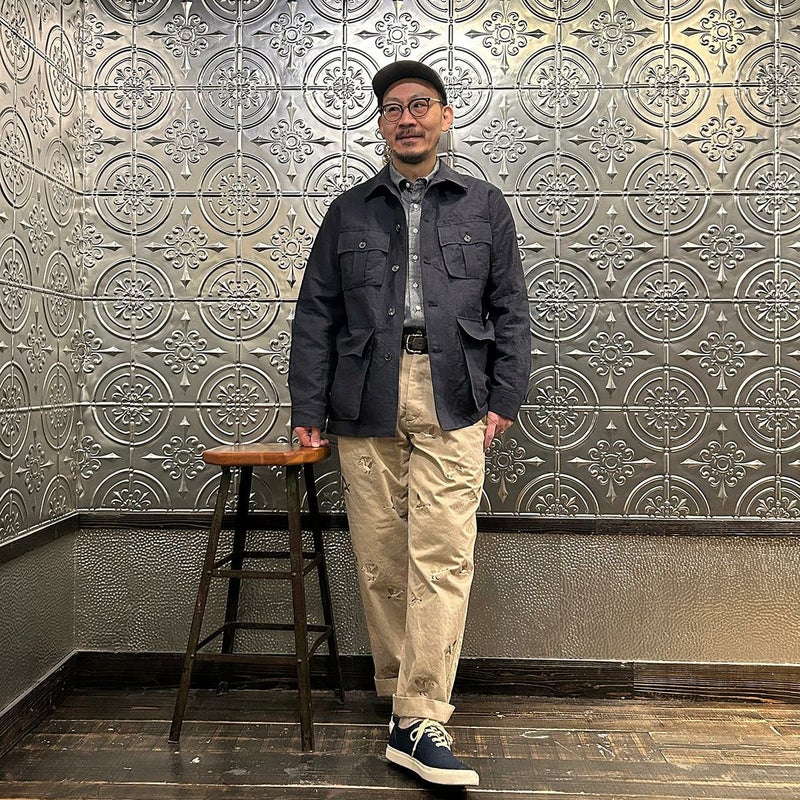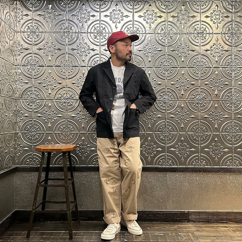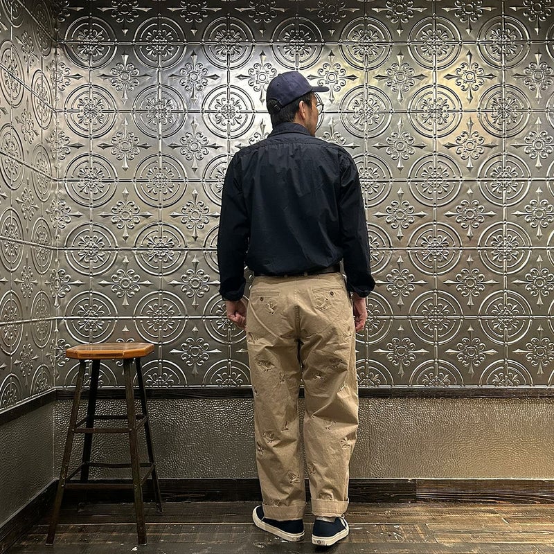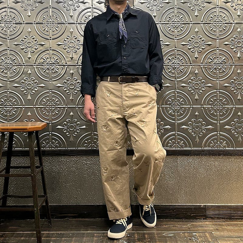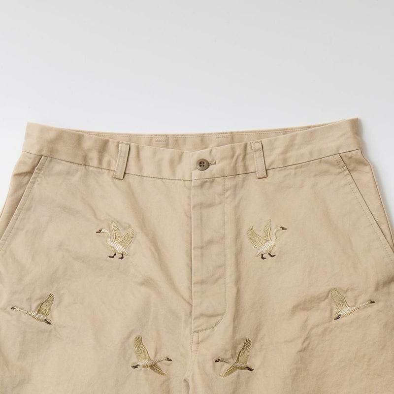 国内ブランドD.C. WHITE(ディーシーホワイト)のVINTAGE CHINO PANTS。ウェストポイント素材を使用したヴィンテージライクなチノパン。前立てはボタンフライ。左右にスラッシュポケット。バックの左右に両玉縁ポケット。ほぼ絞りのない太めのシルエット。刺繍のモチーフは白鳥。刺繍を単調な並びではなく、生地の段階で製品のパンツになった時のバランスを考え配置。ウエストポイントの経年変化も楽しみな1本。
