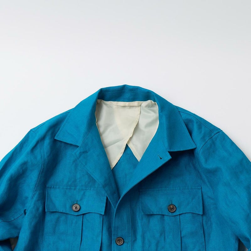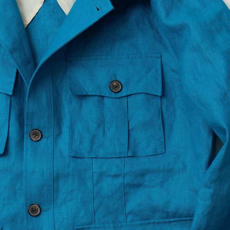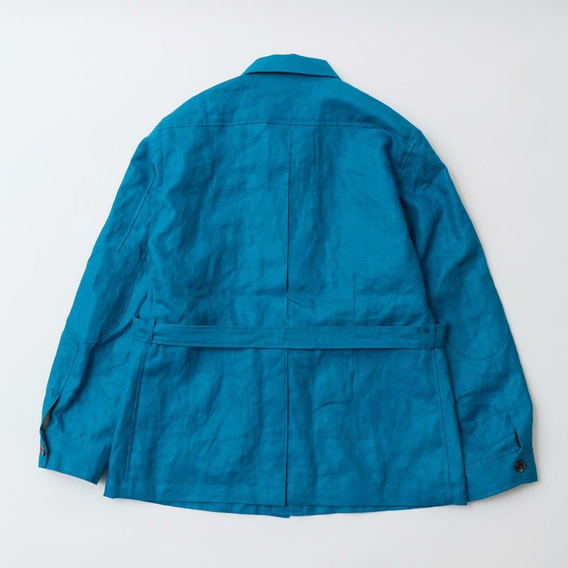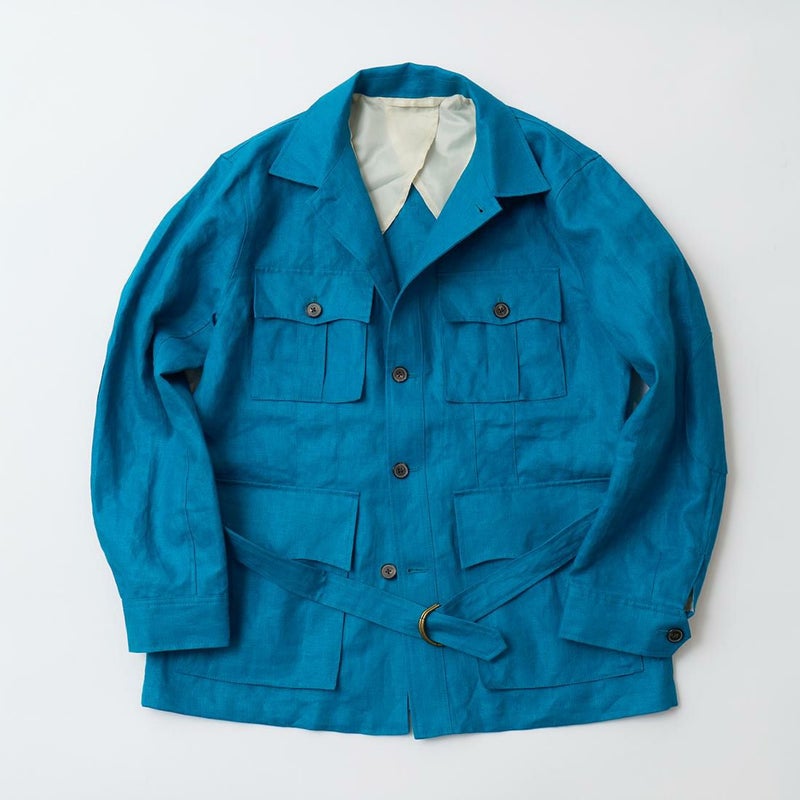 国内ブランドD.C. WHITE(ディーシーホワイト)の"MAINE" SPENCE BRYSON IRISH LINEN。深い森と青い海、自然豊かなメイン州の大地の中でアクティブに活躍するフィールドジャケットをイメージして作成されたジャケット。フロントには容量の大きい4つのパッチポケット。袖口はカフス仕様。ウエストベルトや背面のアクションプリーツ、補強された肘パッチなど実用性とデザイン性が両立されたディテール。素材はスペンスブライソン社のアイルランド製のアイリッシュリネン。1891年創業の老舗メーカーでアイリッシュリネンを語る上で欠かせない老舗ミル。発色の良さもポイント。