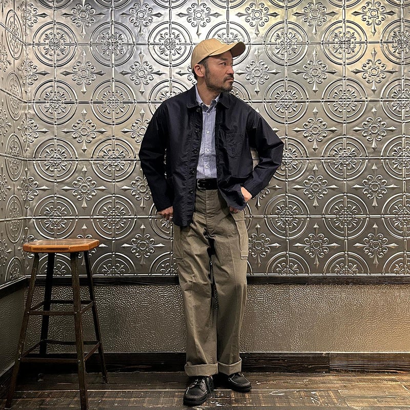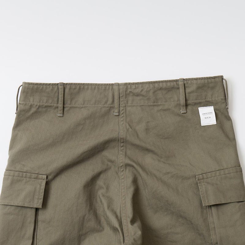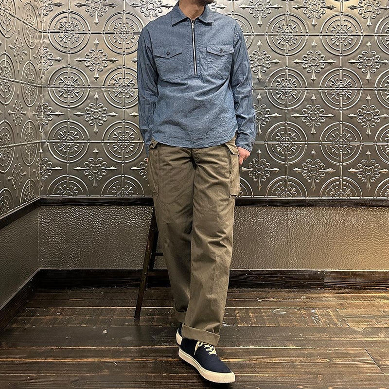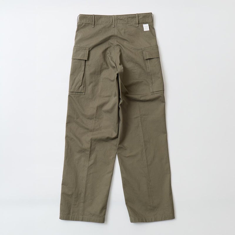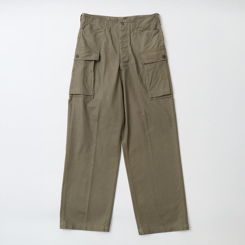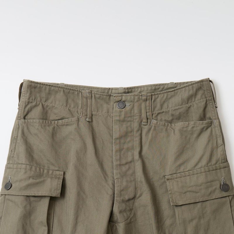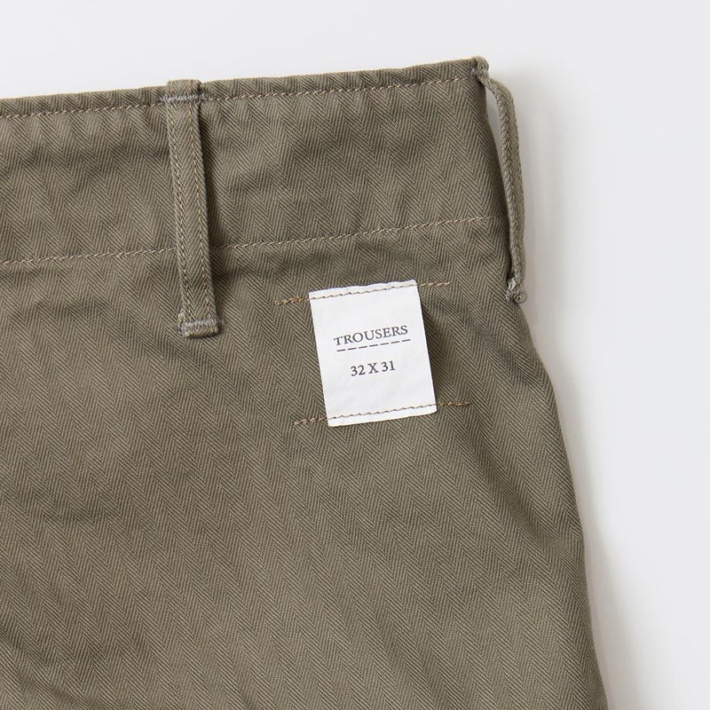 WORKERS(ワーカーズ)のM43 TROUSERS MOD。コットンヘリンボーン素材を使用したミリタリーパンツ。アメリカ陸軍に採用されていた、通称M-43タイプのトラウザースがデザインソース。大きめのサイドポケットが特徴的。本来は存在しない利便性の高いL字型のポケット。前立てはボタンフライフロント。黒塗りの13STARボタン。深めの股上。ゆったりとしたワタリ幅で裾幅も広い無骨なシルエット。経年変化も楽しみな1本。