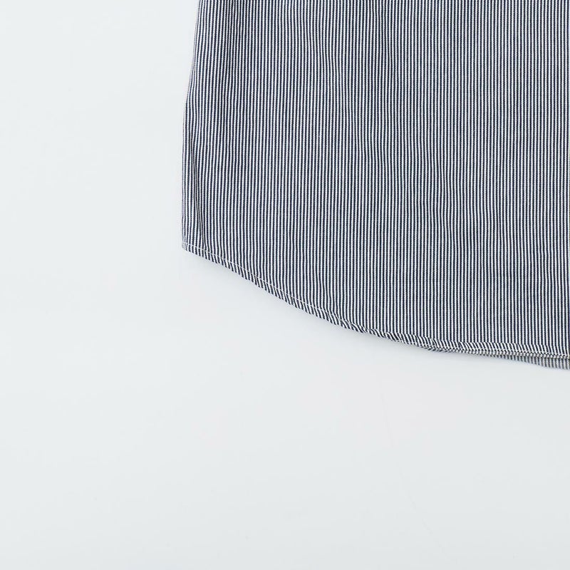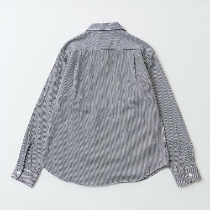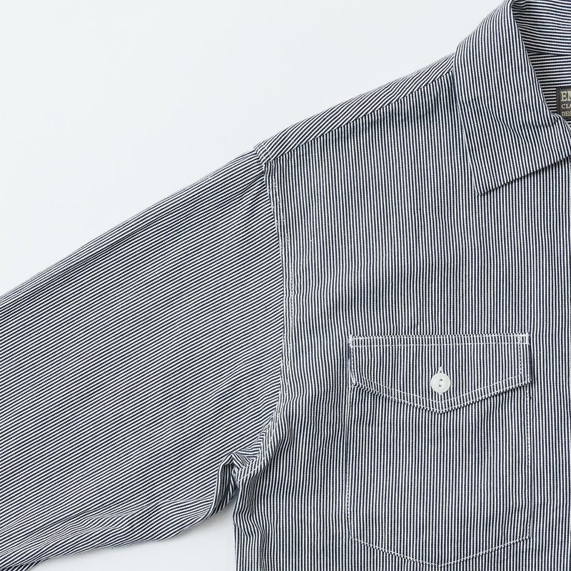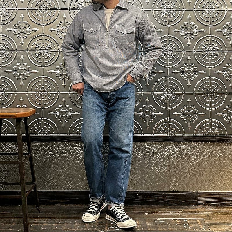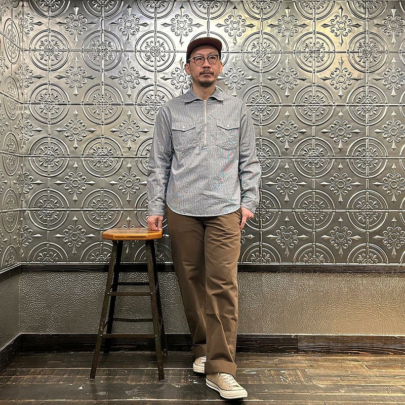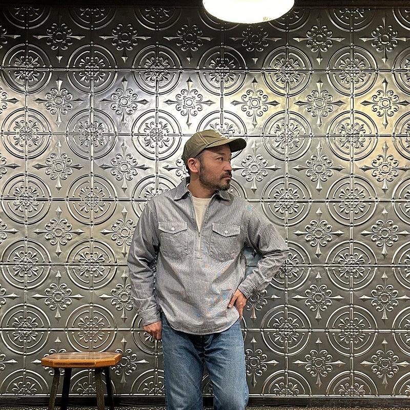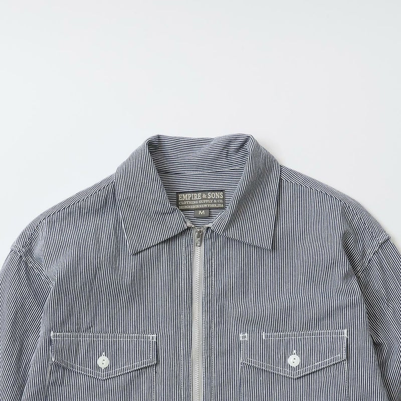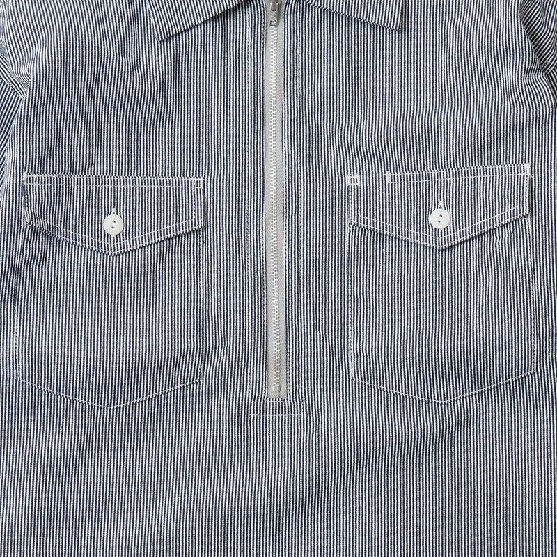 EMPIRE&SONS(エンパアアンドサンズ)のL/S HALF ZIP WORK SHIRT HICKORY STRIPE。1930年代のワークシャツを彷彿させるハーフジップワークシャツ。ハーフジップの襟元。胸の左右に大きめサイズのフラップ付きのパッチポケット。ワークシャツらしいゆったりとしたシルエット。素材はヒッコリーストライプ。ワンウォッシュ済でパッカリングが良い感じに出ています。