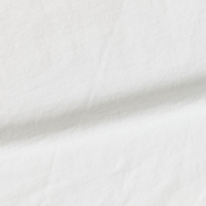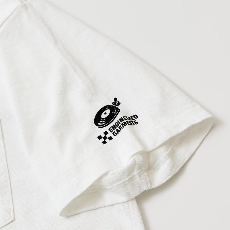 ENGINEERED GARMENTS (エンジニアド ガーメンツ)のPRINTED CROSS CREW NECK T-SHIRT。Vネックとクルーネックの中間的な雰囲気を持つクロスオーバーネック、前と後ろで着丈の違う仕様、裾のサイドスリットが特徴的なディテールのオリジナルボディを使用。フロントと左袖に今季のコレクションの象徴的なプリント。程よい厚さのあるボディなので単体でもインナーでも使える汎用性の高い1着。