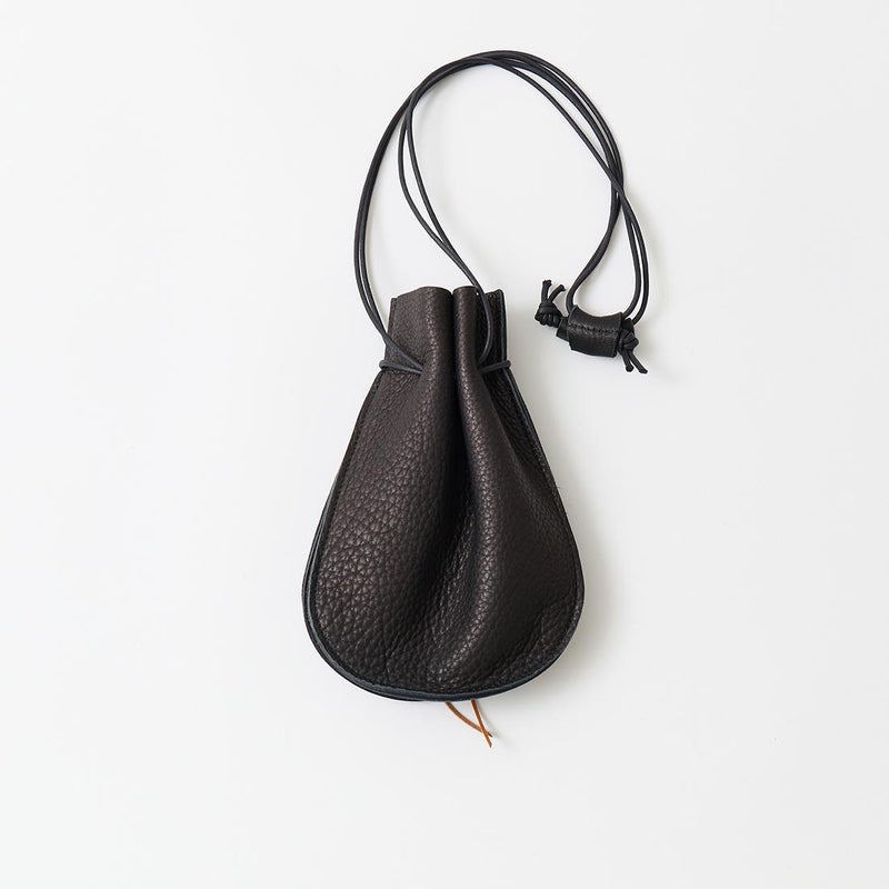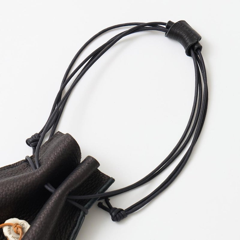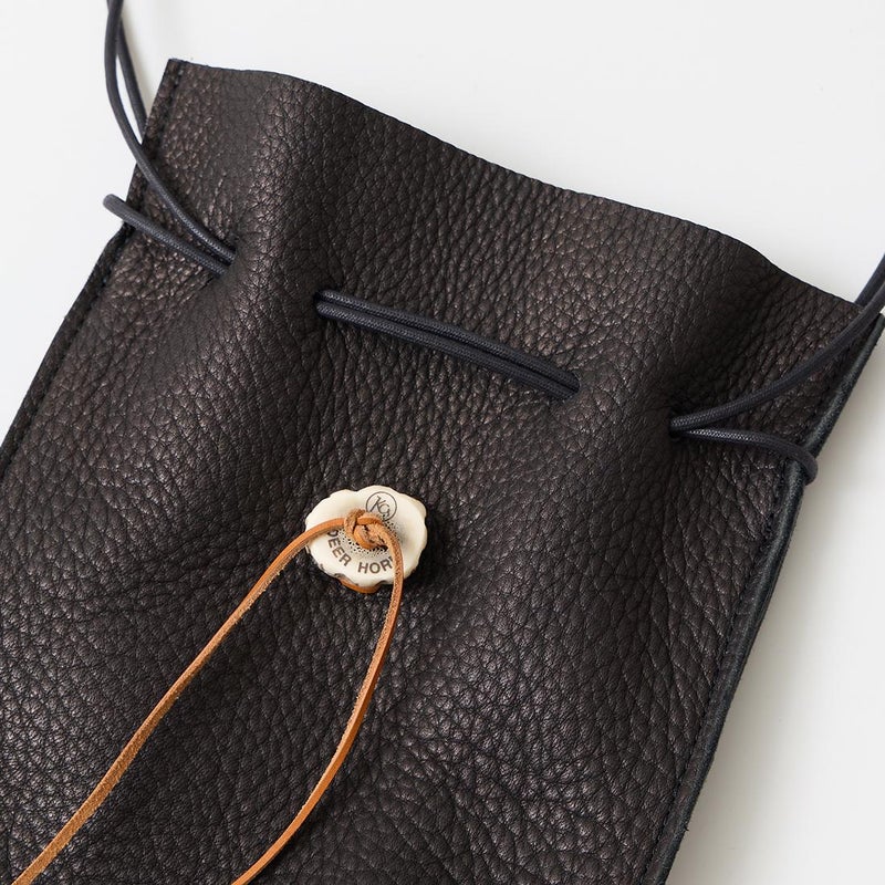 KC,S LEATHER CRAFT(ケーシーズ レザークラフト)のDEERSKIN MINI SHOULDER。しなやかで柔らかい質感の上質なシカ革を使用した巾着ポーチ。ケイシイズオリジナルのレーザー刻印を施したシカ角のボタン。レザーストラップは長さ調節が可能。手持ちバックとしてもショルダーバックとしても使える仕様。スマホやミニウォレットなどが収納可能な普段使いしやすいサイズ感。
