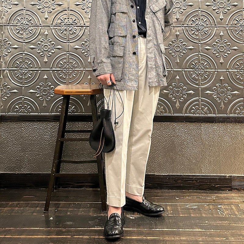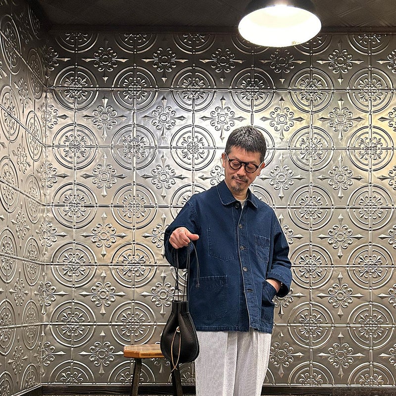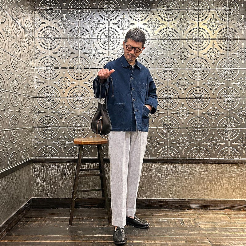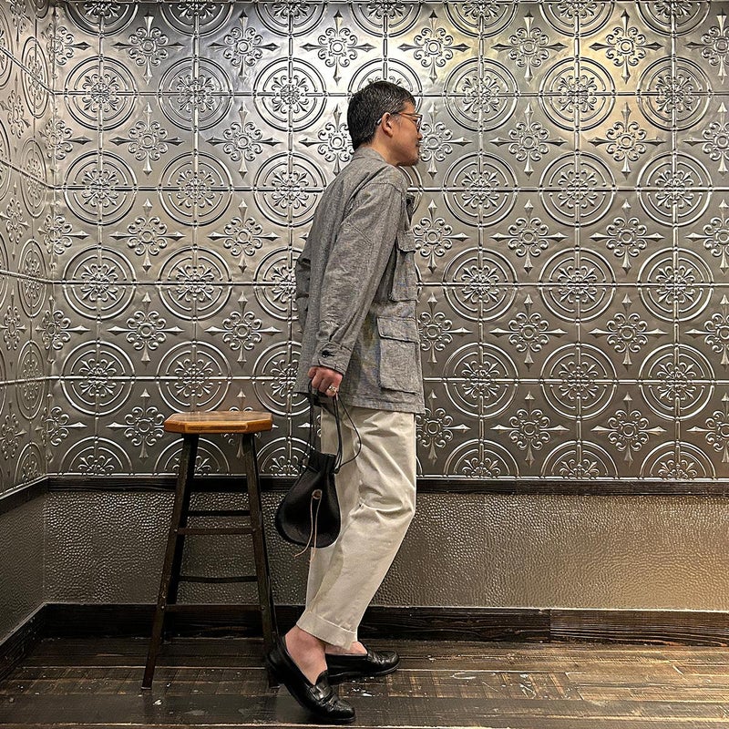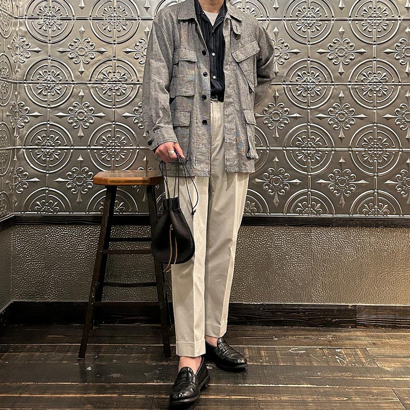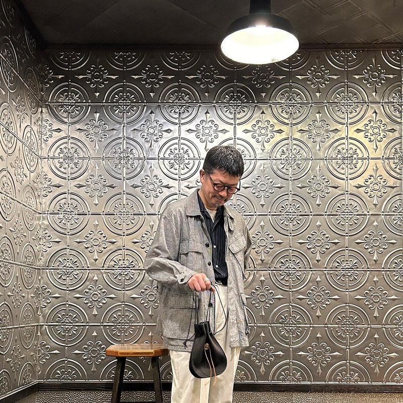 休日のバッグとしては十分な容量を確保したサイズ。紐の長さを微調整すれば手持ち、肩かけとしても使える便利さ。しかも開閉のがめちゃくちゃ楽。シンプルなスタイリングでもコレを持っているだけで雰囲気出す事ができるアイテム。個人的にかなり好きですね。