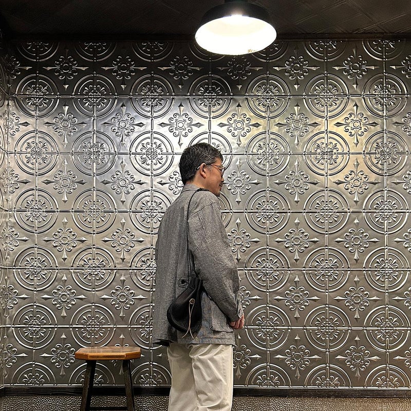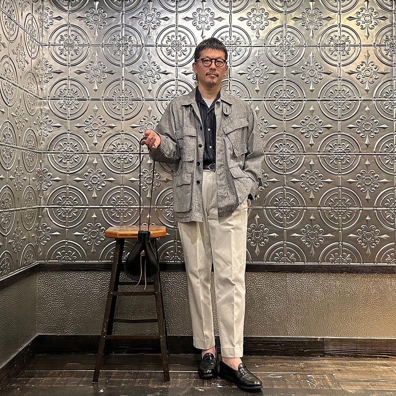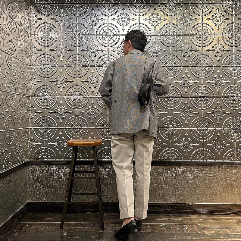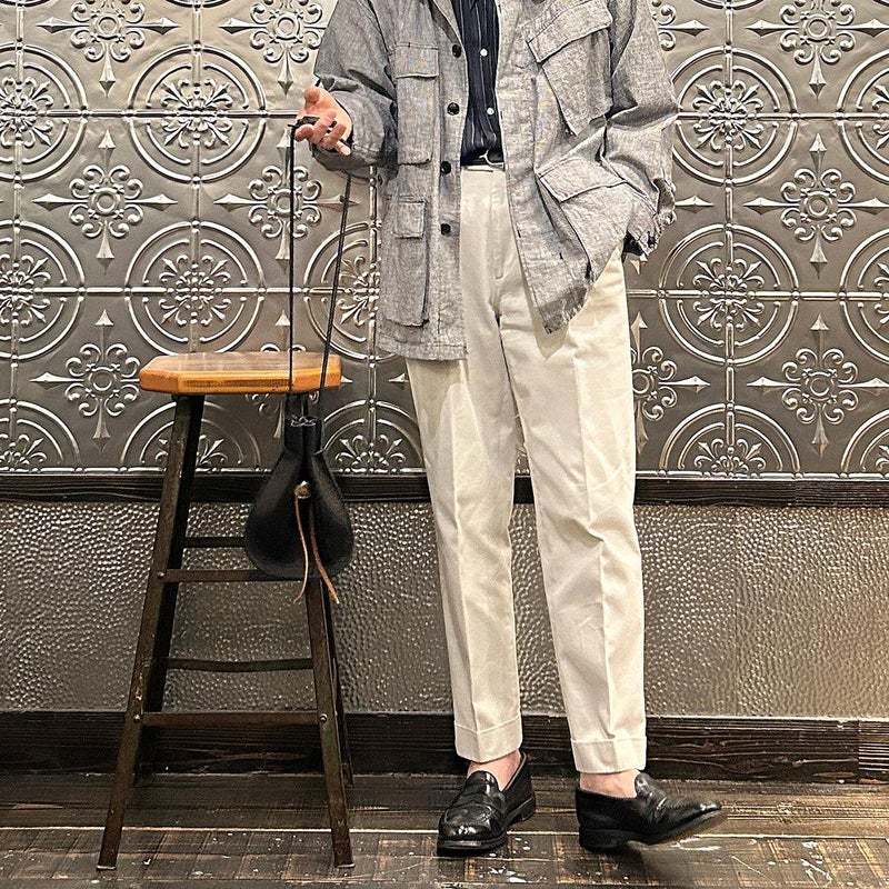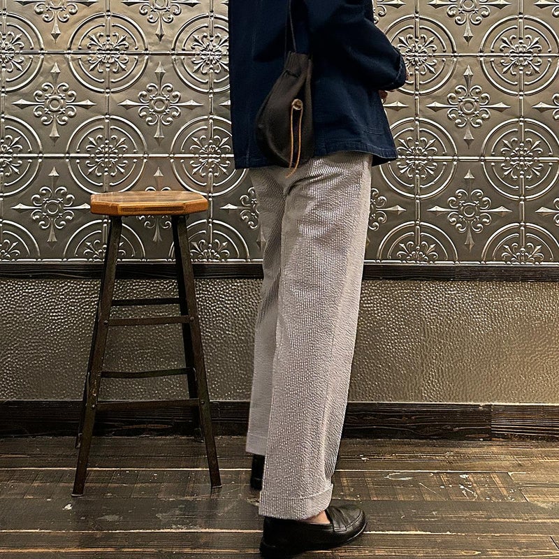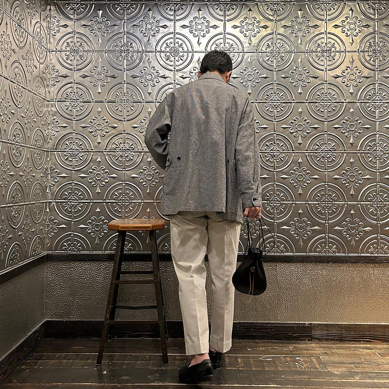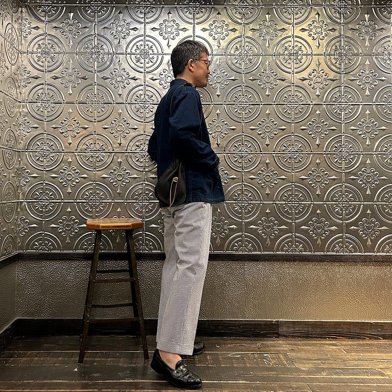 休日のバッグとしては十分な容量を確保したサイズ。紐の長さを微調整すれば手持ち、肩かけとしても使える便利さ。しかも開閉のがめちゃくちゃ楽。シンプルなスタイリングでもコレを持っているだけで雰囲気出す事ができるアイテム。個人的にかなり好きですね。