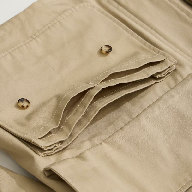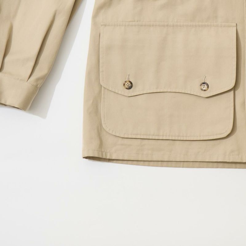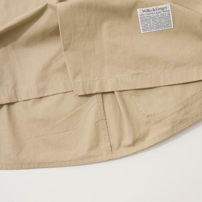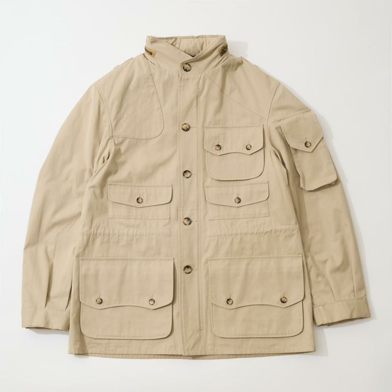WILLIS&GEIGER(ウィリスアンドガイガー)のWHITE HUNTER FIELD JACKET。プロハンターや探検家たちに愛されたウィリス&ガイガーを代表するホワイトハンターフィールドジャケット。表地と同じ生地を裏地にも使う贅沢な仕様。スタンドカラーにはフードが収納され前立てはジップとボタンの2重構造。タロン社製のジップを使用。ウエスト部分にドローコード。特徴的なフロントの多種多様なポケット。右肩にはガンパッチ、左袖にはメガネポケットや肩のエポレットも特徴的なデザイン。当時一番恐れられていたマラリア蚊から皮膚を守ってくれる鎧のような役目も果たした高密度コットン生地「340コットン・ブッシュ・ポプリン」。1インチあたり340本の二重撚り綿糸で織り上げる高密度な生地。赤タグ時代のオリジナルブッシュポプリンを色、組織共にほぼ完全再現。ホワイトハンターフィールドは「Professional outdoor's man」とも呼ばれ、当時のウィリスアンドガイガーの持てる技術を注ぎ込んだブランドを代表する1着。