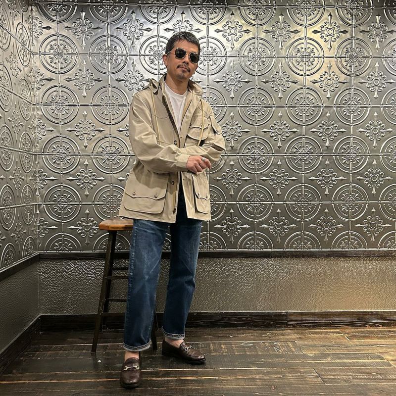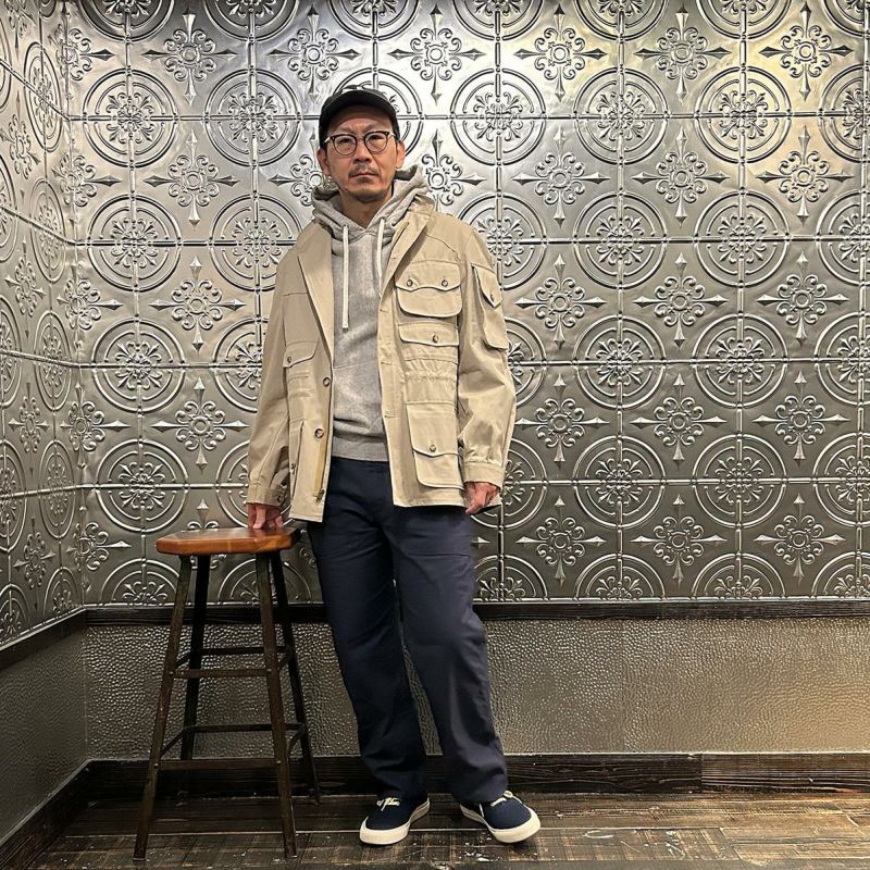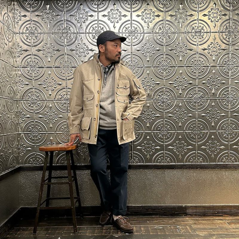 172センチ60キロでサイズは「36」です。中に少し着込める余裕があるサイズ感。ジャケットなどの上にコート感覚で着れます。昔のまあのシルエットなので腕周りもゆったり目に作られていてストレスなく着れます。ウィリス&ガイガーの名品復刻シリーズも遂にここまで来ましたね。通称ホワイトハンターフィールドジャケットと言われる逸品。ブランドを代表する340コットンブッシュポプリンを表地、裏地に贅沢に使い、デザイン性と機能性を考えて付けられた数多くのポケット。当時と同じく型紙をCADを使わずに手で引く事のよる自然な丸みに拘ったクレイジーな仕上がり。このディテールのパーツ数を考えると凄い時間と労力を要するのは明らかですからね。今回は日本製での復刻になり、世界最高のクオリティーである事は間違いありません。US製でなくなった分プライスは多少抑えられたのも嬉しい限り。お好きな方はお見逃しなく。古着の市場でデッドストックで入手する事も難しいでしょうし、ホワイトハンターフィールドの新品が手に入る事なんて今後はないでしょうからね。