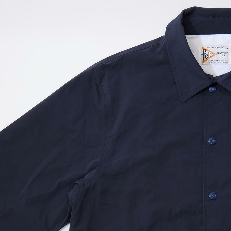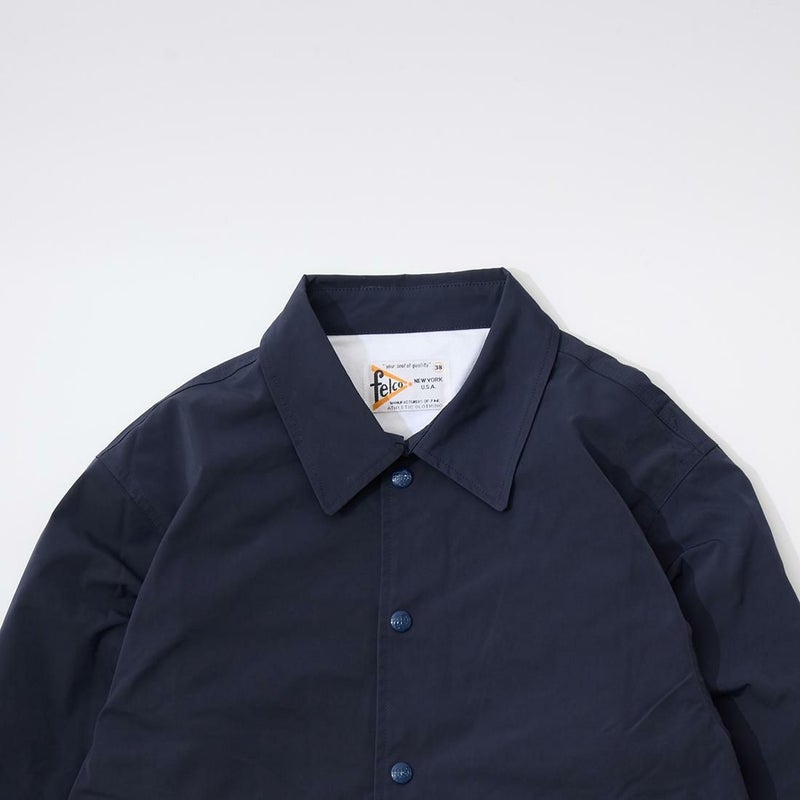 FELCO(フェルコ)のSET IN SLEEVE COACH JACKET SNAP BUTTON FRONT W/FLANNEL LINING CLASSIC FIT。撥水性を持つウォータープルーフナイロンを使用したスナップフロントのコーチジャケット。襟は大きめで風防のチンストラップが付属。ポケットはフロントに2つと、内ポケット2つ、そして背面右側にはデザインとしてもポイントになるポケットを配置。裏地にはコットンフランネルのライニングが付き、袖口はスナップでサイズ調整が可能なゴム仕様。こちらは従来のモデルよりも全体的にゆとりを持たせたクラシックフィット。ストレスのない着用感で重ね着もし易いコーチジャケットに仕上がっています。