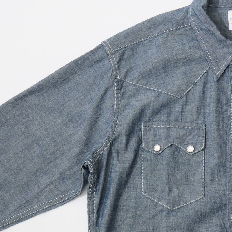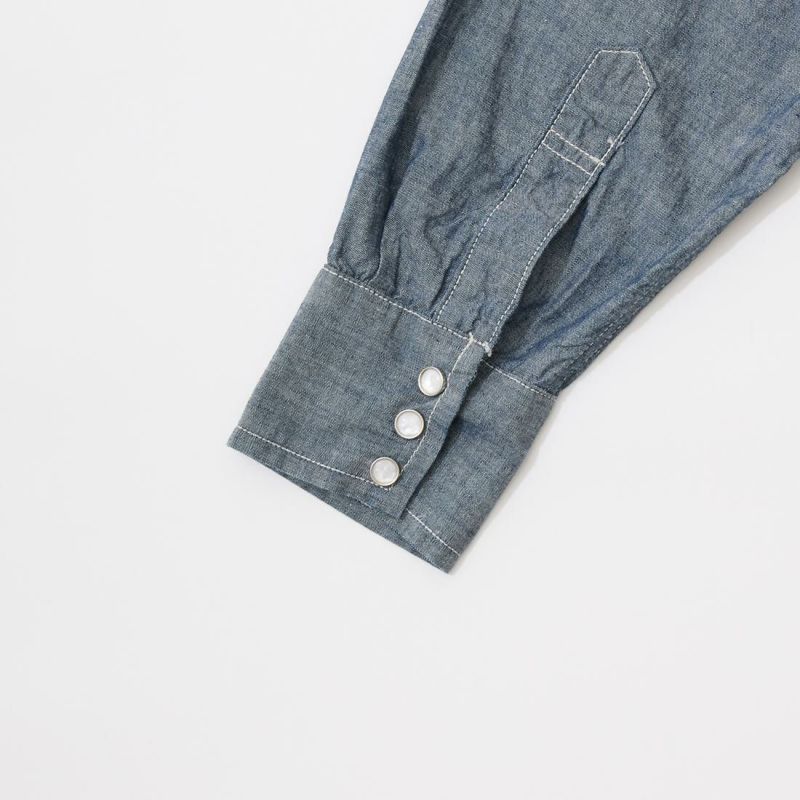 WORKERS(ワーカーズ)のWESTERN SHIRT 5oz CHAMBRAY。5オンスのコットンシャンブレーを使用したウエスタンシャツ。前後のウエスタンヨーク。スナップボタンフロント。左右に配置された特徴的なデザインのフラップポケット。典型的なウエスタンシャツのデザイン。緩めのウエストシェイプ。シャツイン、アウトで使い易い着丈。シャンブレーの経年変化も楽しめるスタンダードな1着。