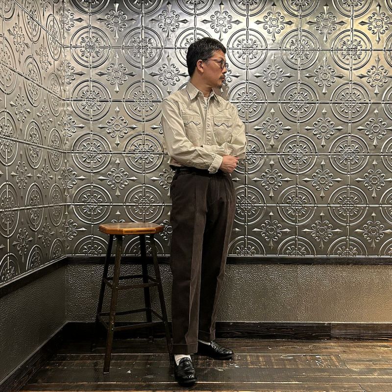 172センチ60キロでサイズは「14」でジャストサイズです。同型を複数生地で展開しましたがこのリーサテンタイプが一番刺さりました!シャツとしては少し厚手の部類ですが、これを着倒す楽しみの方が上回りますね。独特の生地の光沢と色合いも最高です。ウェスタンシャツ好きな私としては待望過ぎました。本来のウェスタンシャツの様に細い身幅で長い着丈、その割に腕回りは太いというアンバランスなものではなく、計算された今着れるウェスタンシャツに仕上がっています。イタリアのシャツブランドが提案するスタイリッシュで艶っぽいモノではなく、かといってゴリゴリのアメカジでもないウェスタンシャツって探してもないんです。これは展示会で見かけた時にイメージにピッタリだったので嬉しくて沢山オーダーしちゃいました。私のオススメはジャケットのインナー。ドレスっぽいスタイルのカジュアルダウンに使うウェスタンシャツがカッコイイと思っています。もちろんゴリゴリのアメカジ、ウェスタンスタイルにも素敵だと思います!