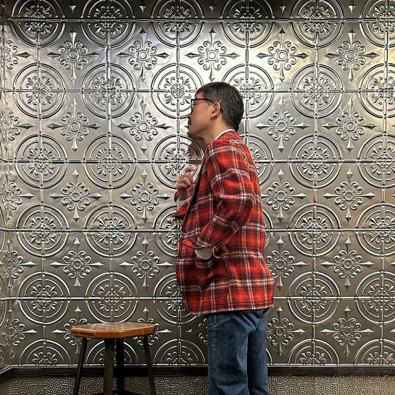 172センチ60キロで「44」で丁度良いサイズです。冬の着用を見越したサイズ感。中にそれなりに着込める余裕があります。レザーのくるみボタンと袖口のカフ仕様。アメリカのペンドルトンを彷彿とさせるディテール。アメリカンクラシックなワークなディテールをディーシーホワイトのテーラーリングで編集したジャケット。生地もアメリカンなざっくりコットンフランネルではなく、柔らかくドレープ感もキレイなウールナイロンアルパカの混紡。シャギー感が柄の出方を柔らかい印象に。シャツを合わせてきちんと着るのも良いですが、古着のTシャツやスウェットなどに合わせてラフに着るのがオススメ。ブランドの編集力が光る一枚ですねっ。