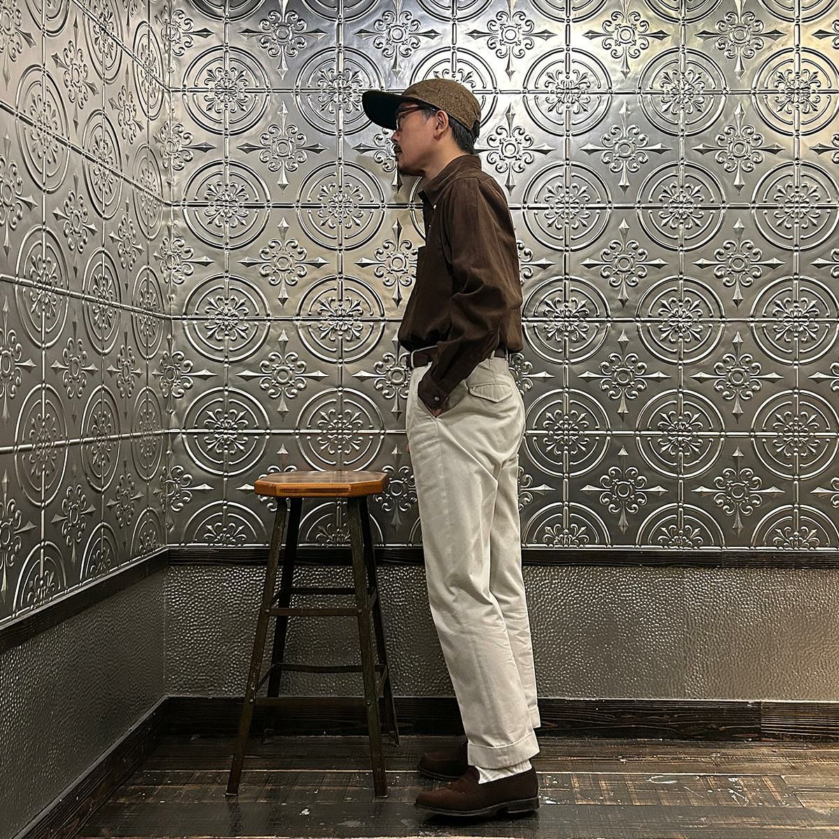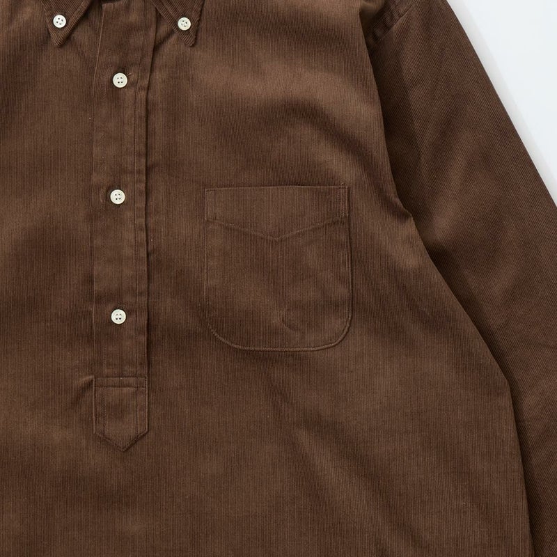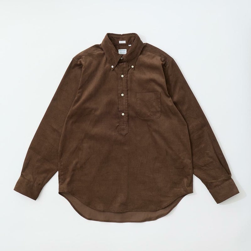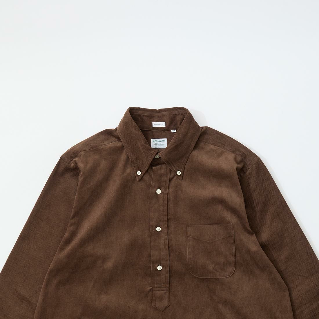 WORKERS(ワーカーズ)のMODIFIED PULLOVER BD SHIRT CORDUROY。ボタンダウンのプルオーバータイプの長袖シャツ。少し大きめの襟が旧き良きアメリカントラッドな雰囲気。左胸にパッチポケットが1つというシンプルなデザイン。 ウェスト部分の絞りは弱く、胴回りがゆったりしたシルエット。素材は5oz程のコーデュロイ。季節感のある1着。