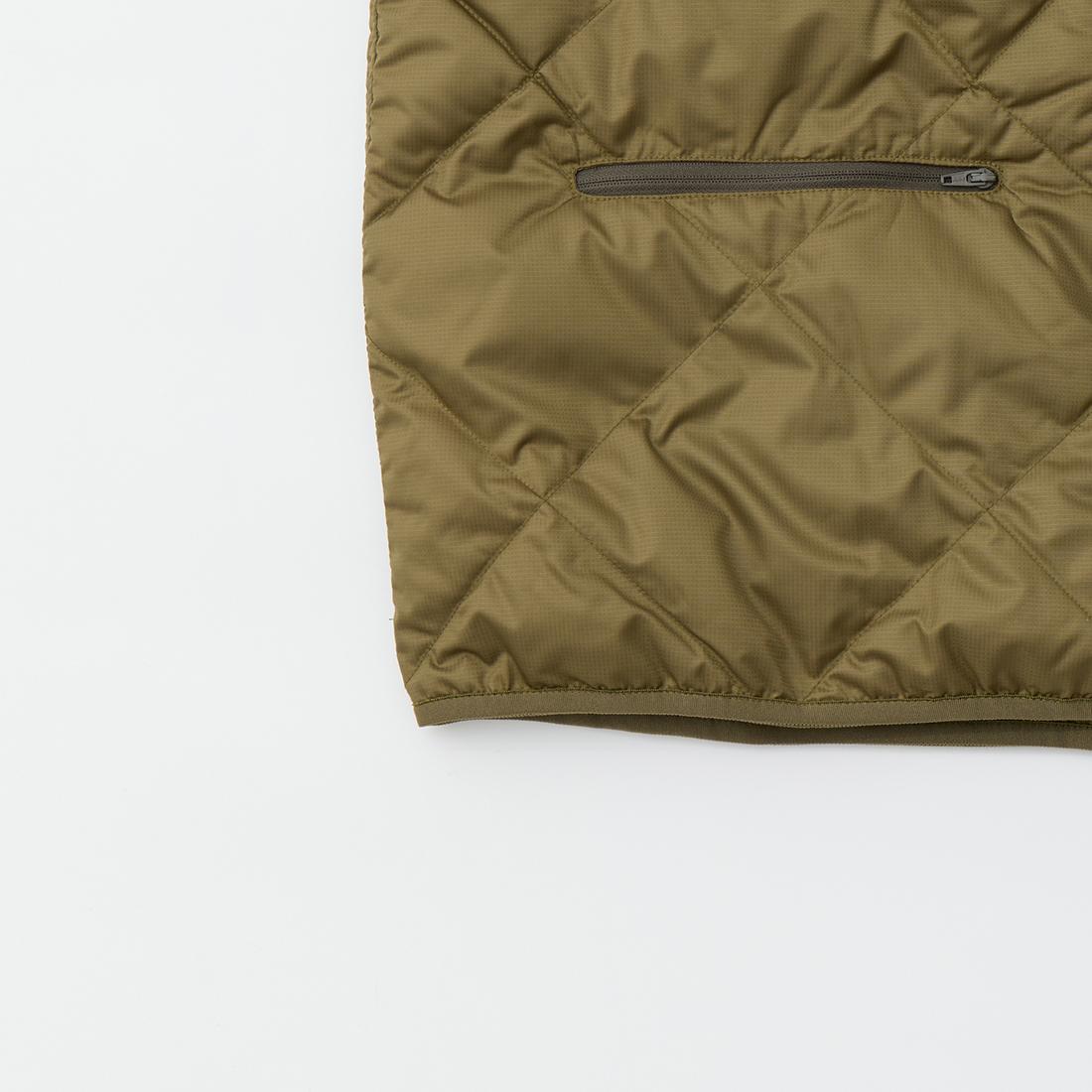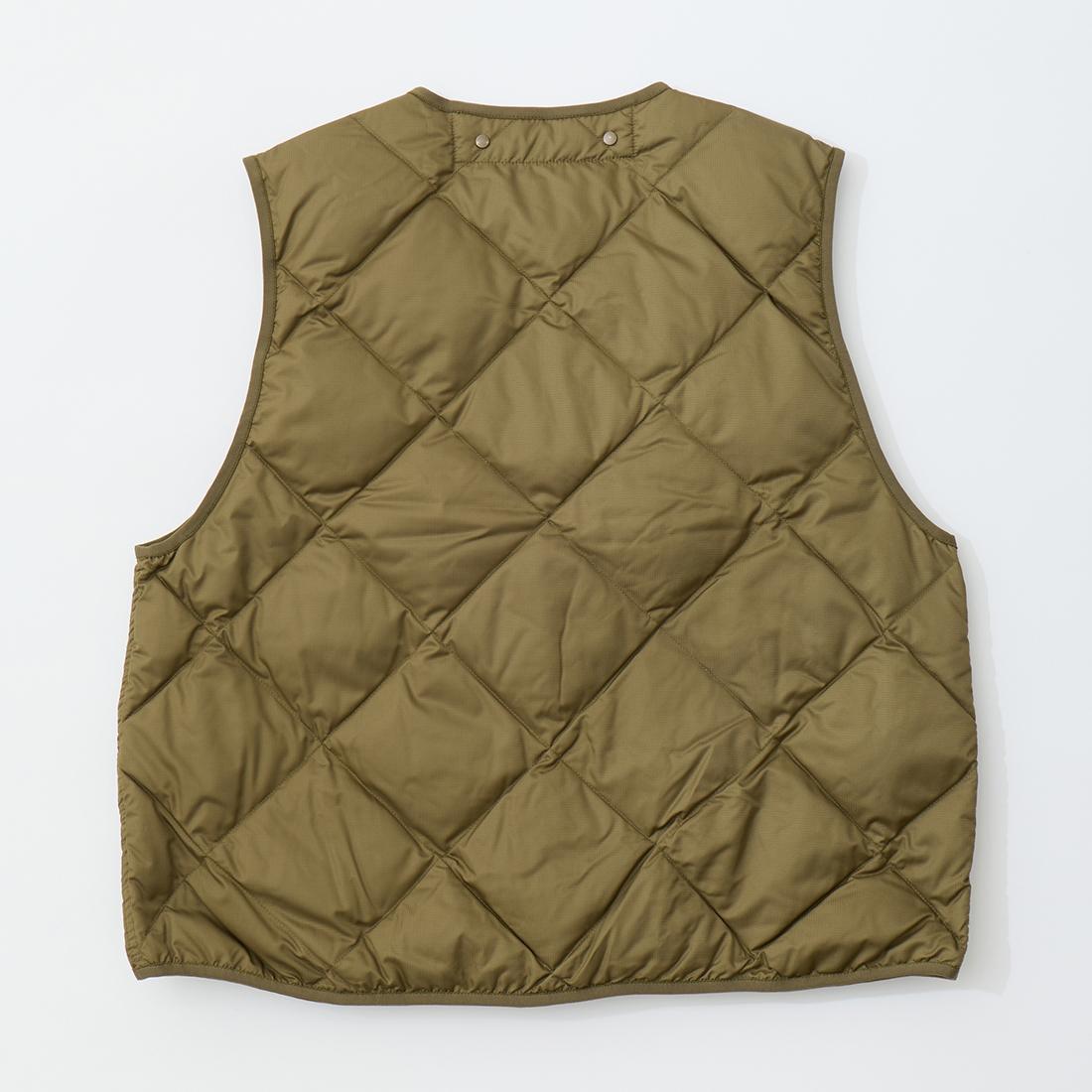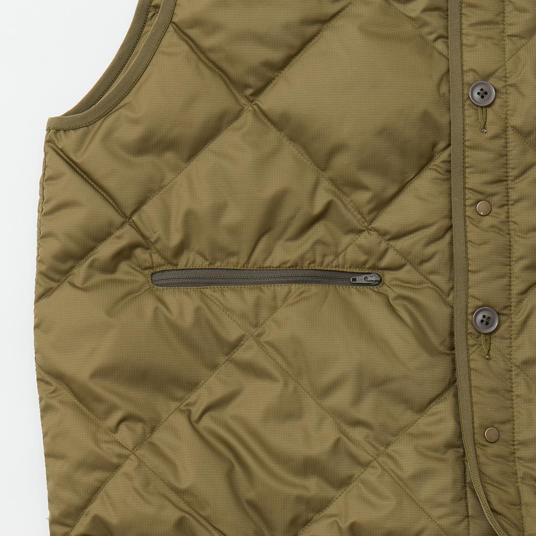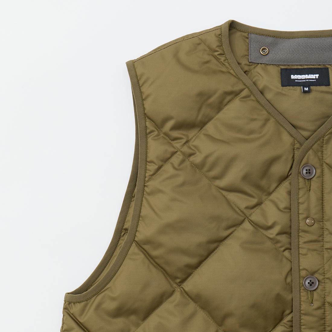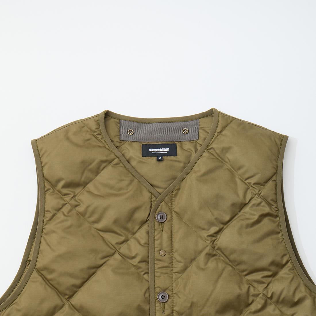 MODMNT(モドメント)のLINER DOWN VEST。表地に高密度に織り上げたマイクロファイバータフタを使用したライナーダウンベスト。インナーを選ばない開き具合のネックライン。ボタンとスナップが交互に配置された前立て。腰部分にはジップポケットを装備。スペイン産ホワイトダウン(国内洗浄)を40g封入。ダウン90%・フェザー10%の混紡で軽快さと快適性を両立。表地に撥水加工が施された機能性も高い1着。