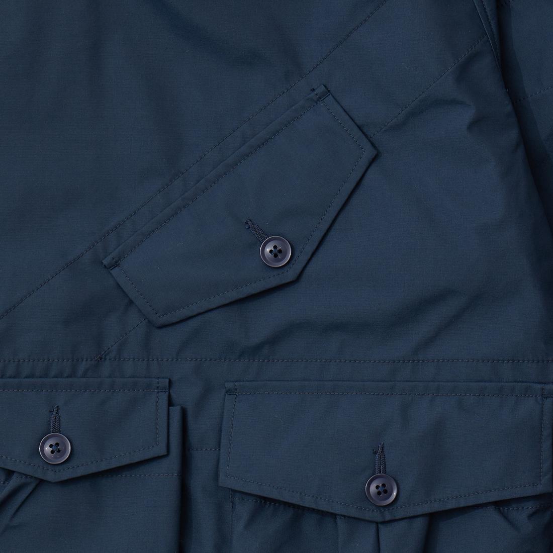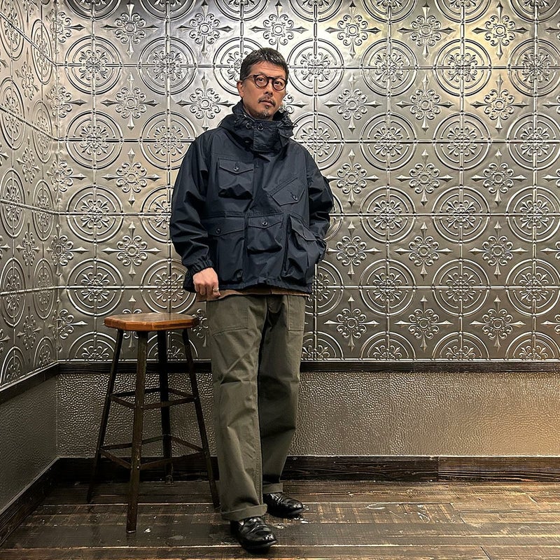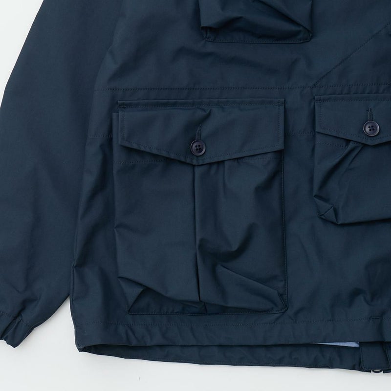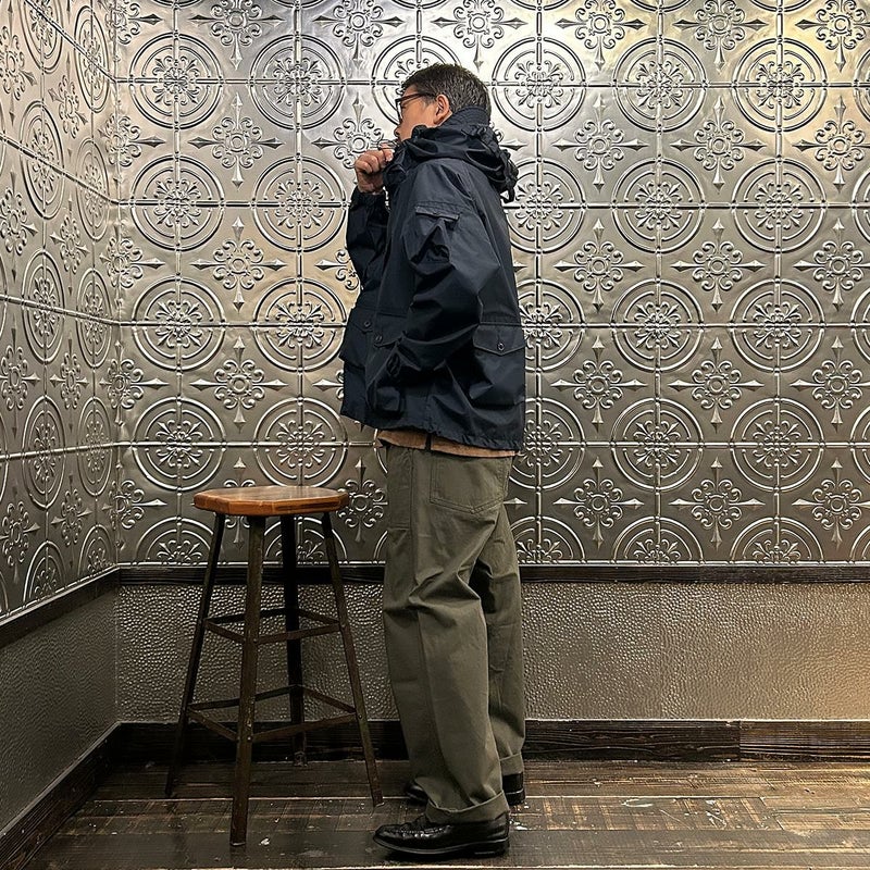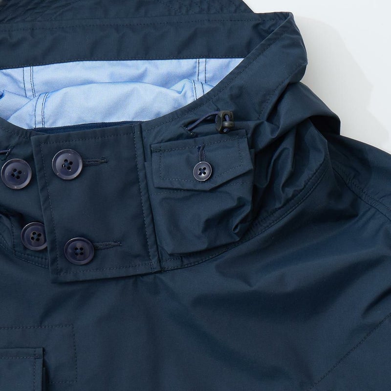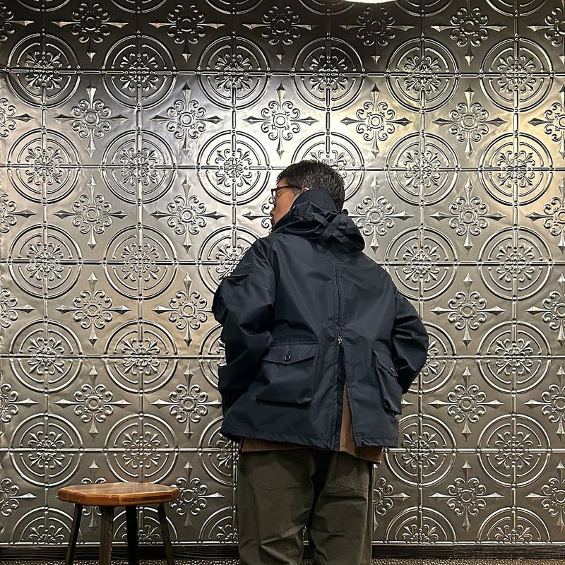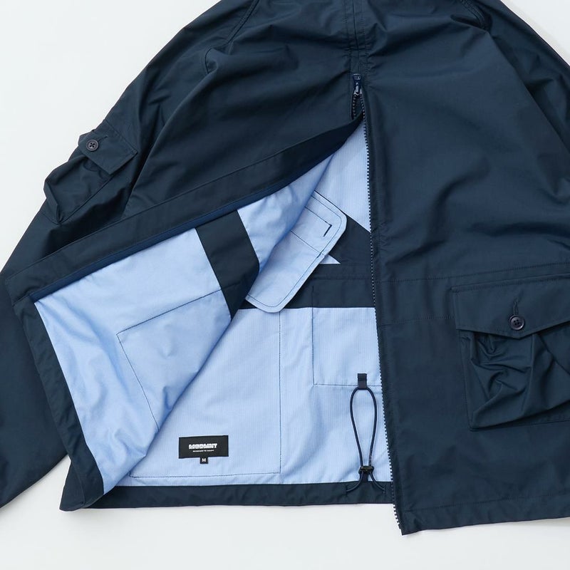 MODMNT(モドメント)のMIL SMOCK SHORT。英軍ロイヤルネイビーのヴェンタイルスモックがデザインソースのジャケット。フィッシング用のジャケットの要素を融合したデザイン。口元まで被る高めの襟。フロントにランダムに配置された多数のポケット。後ろの裾近くにもポケットを装備。バック中央に配置されたジップもポイント。防水性・透湿性を兼ね備えた3層素材を採用。耐水圧11,000mm・透湿度8,500g/m2/24hrという高いスペックのナイロン素材。機能性も高い1着。