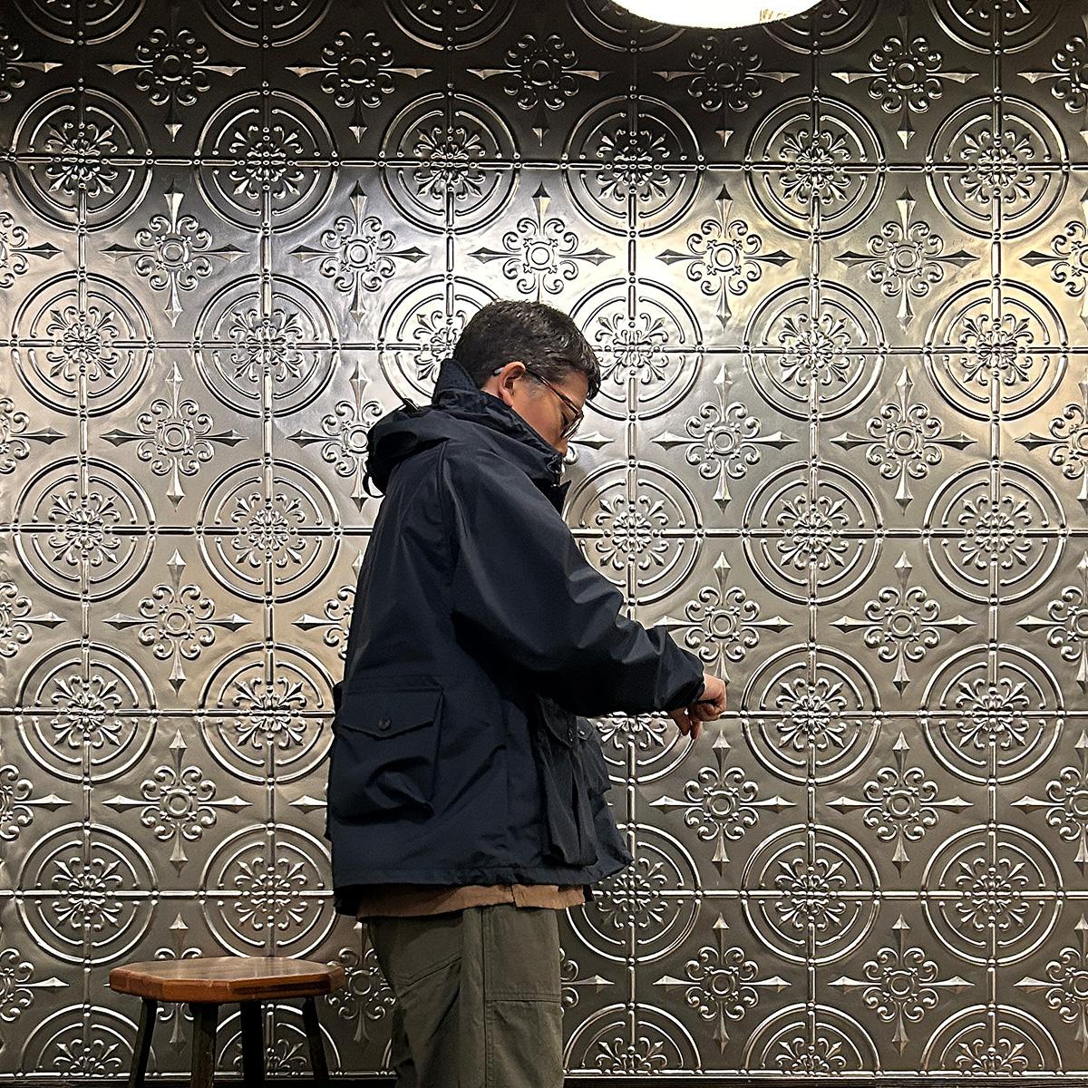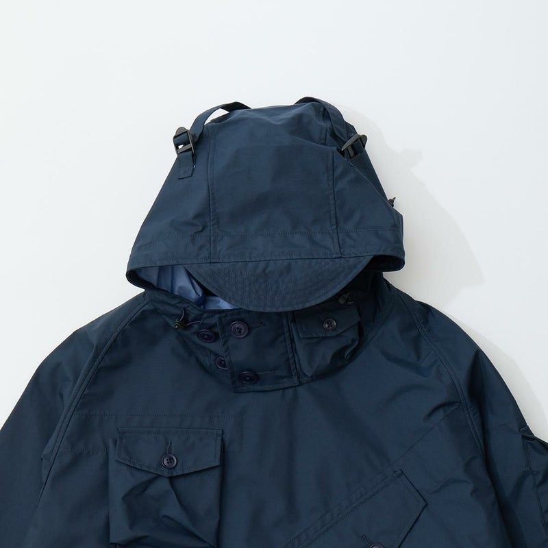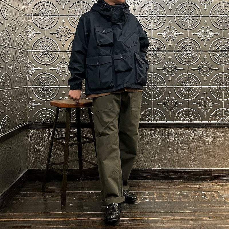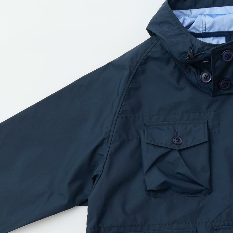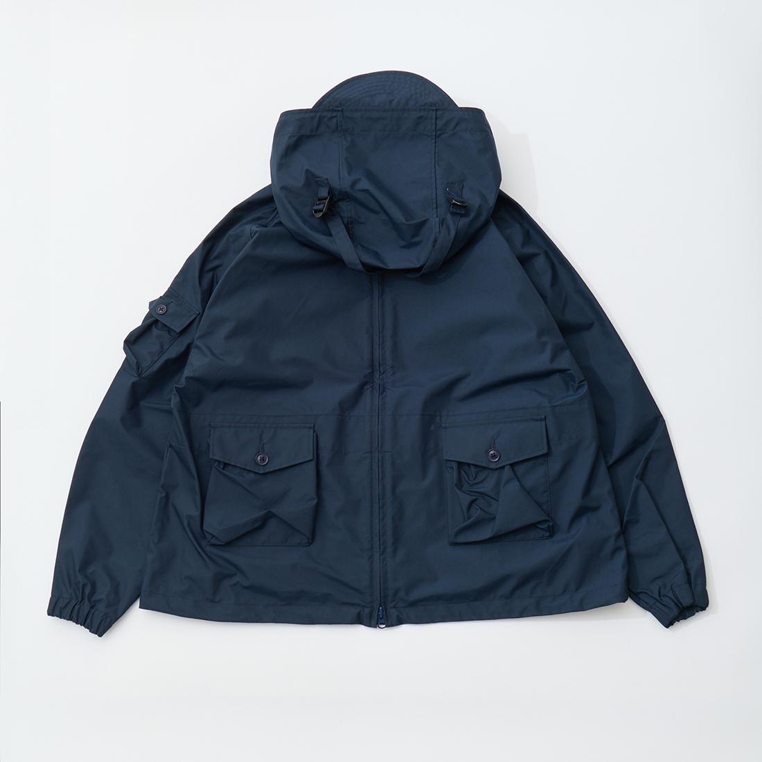 MODMNT(モドメント)のMIL SMOCK SHORT。英軍ロイヤルネイビーのヴェンタイルスモックがデザインソースのジャケット。フィッシング用のジャケットの要素を融合したデザイン。口元まで被る高めの襟。フロントにランダムに配置された多数のポケット。後ろの裾近くにもポケットを装備。バック中央に配置されたジップもポイント。防水性・透湿性を兼ね備えた3層素材を採用。耐水圧11,000mm・透湿度8,500g/m2/24hrという高いスペックのナイロン素材。機能性も高い1着。