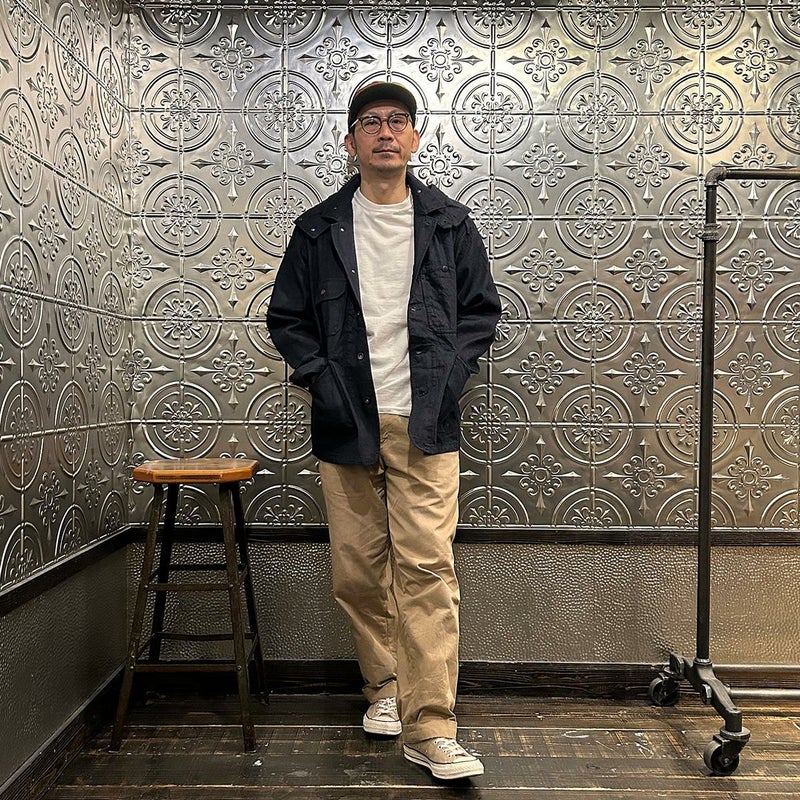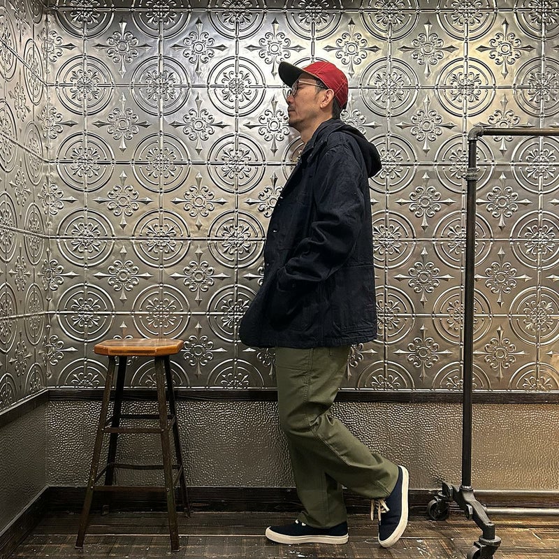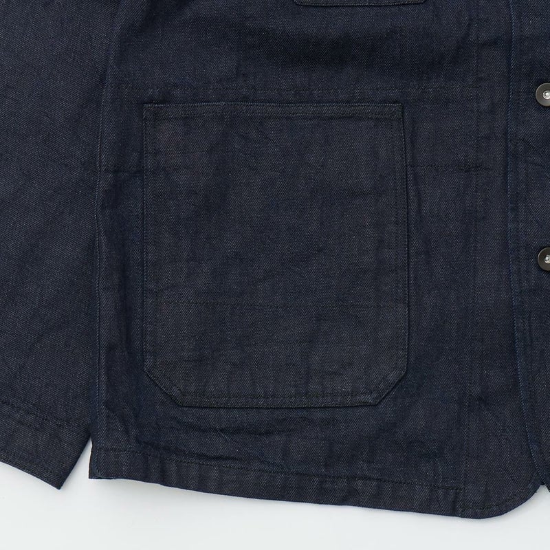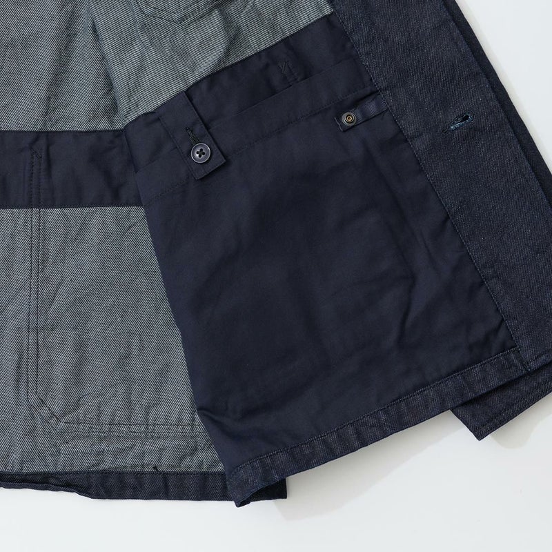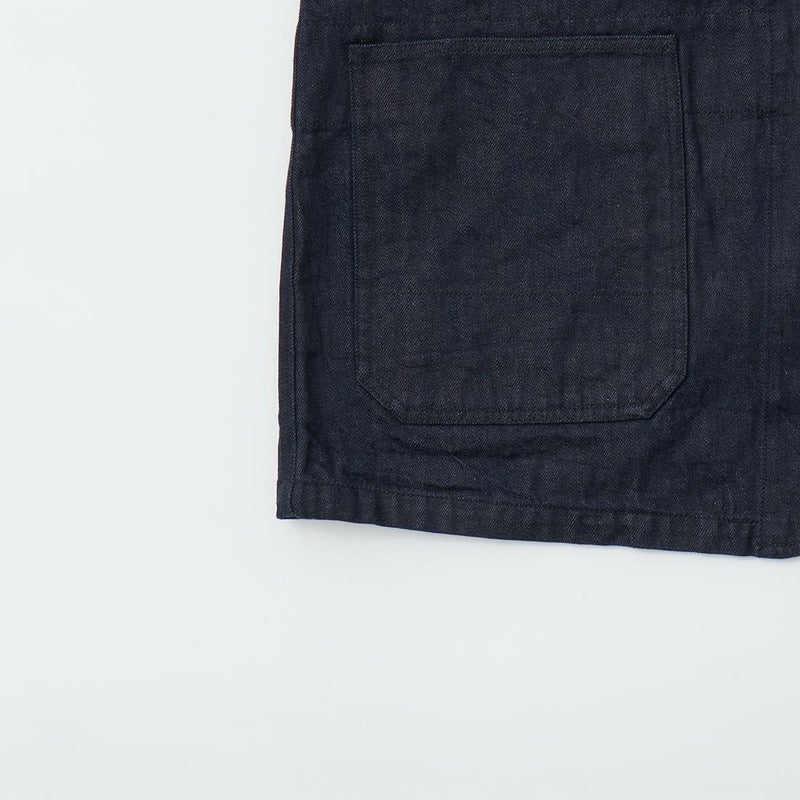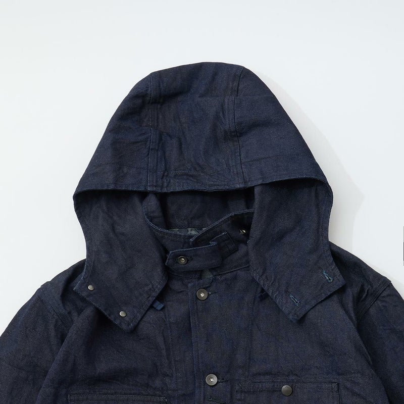 MODMNT(モドメント)のCOVERALL JACKET。10ozのムラ糸デニムを使用したカバーオールジャケット。取り外し可能なデタッチャブルフード。首元にチンストラップ。前身頃と後見頃に配置された多数のポケット。前立てはボタンフロントでドーナツボタンを使用。素材は染めは広島・福山、織りと仕上げは岡山・井原で行われた日本製デニムを使用。