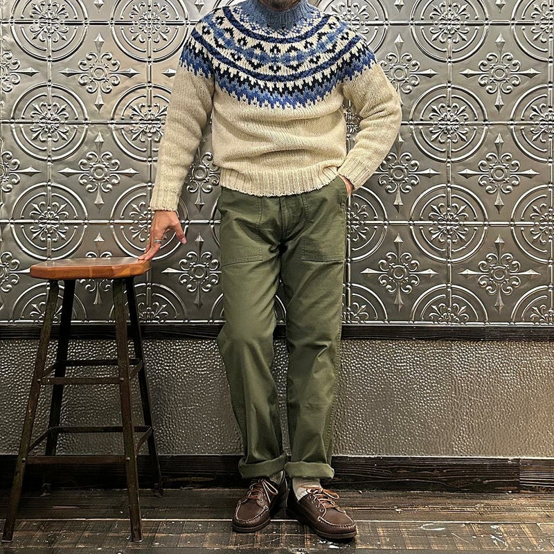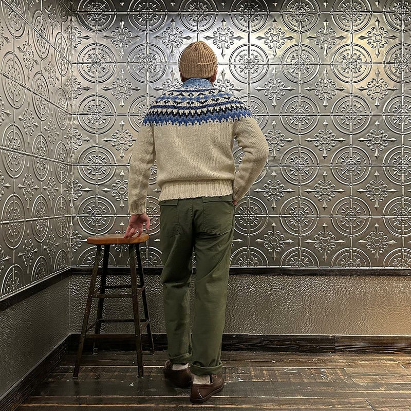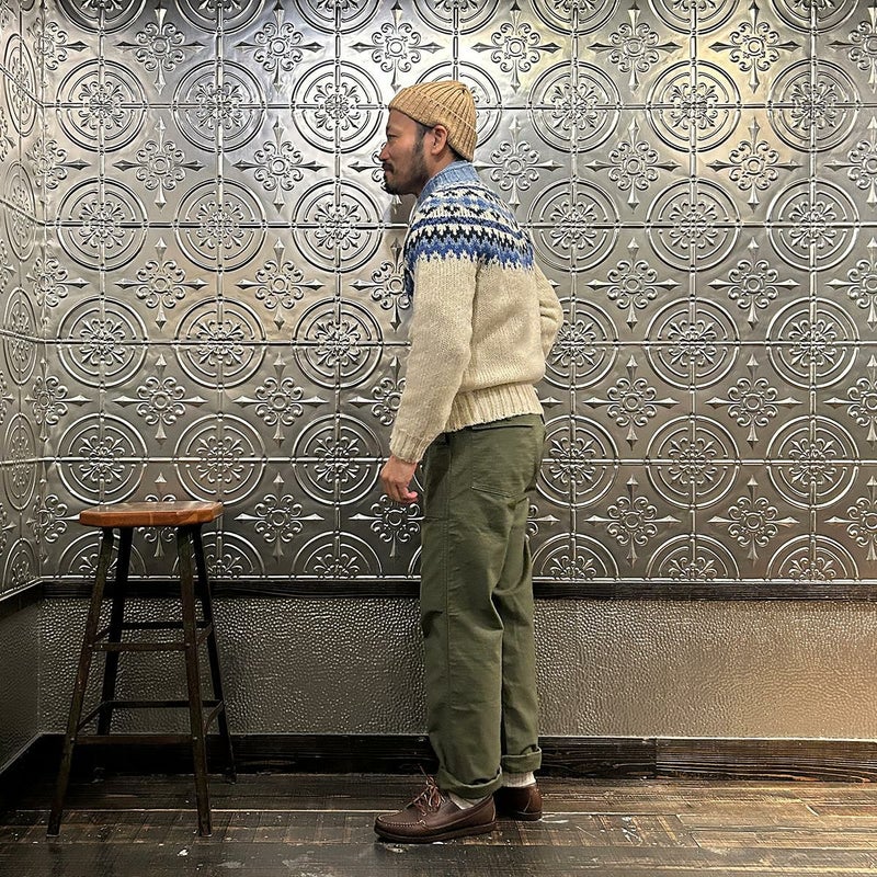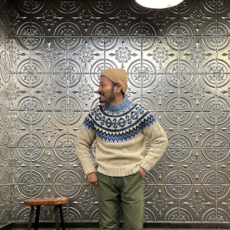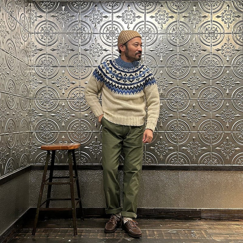 170センチ68キロでサイズは40サイズで丁度良いサイズです。胸元辺りに施されたフェアアイル柄はインナー使いには最適なアイテム。中厚の生地感に暖かみのある雰囲気。軽くて着易いので男女関係なくオススメしたいですね。