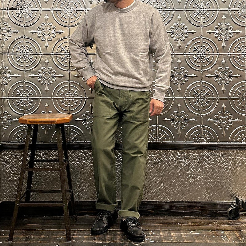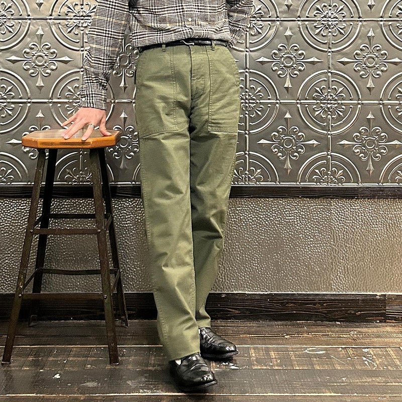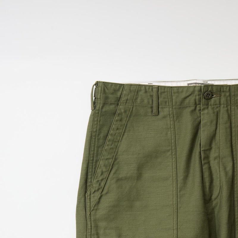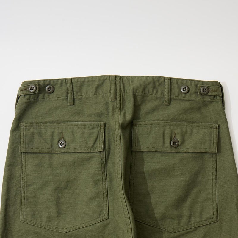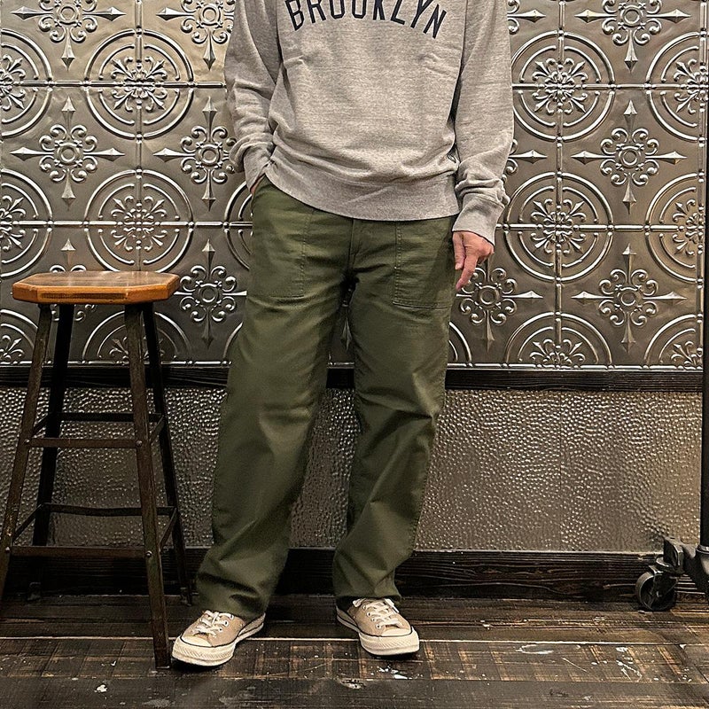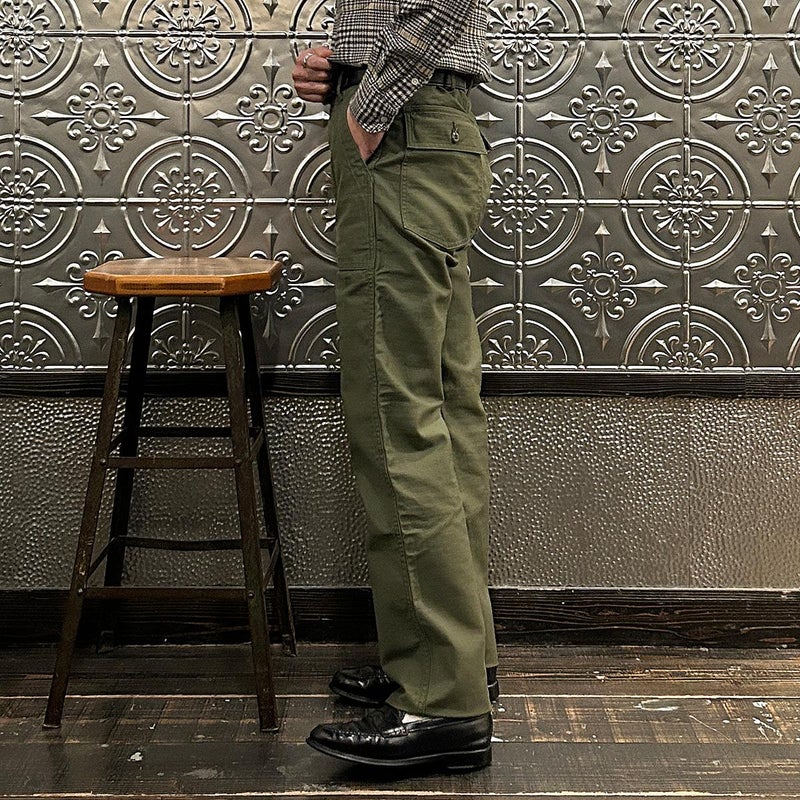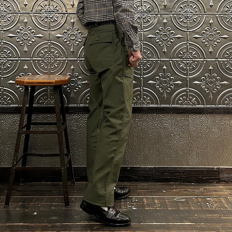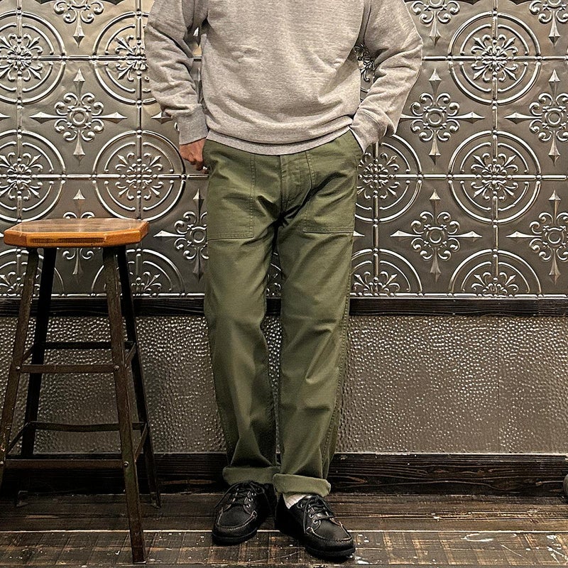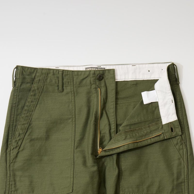 EMPIRE&SONS(エンパイアアンドサンズ)のFATIGUE PANT MILITARY SLUB BACK SATEEN。バックサテン生地をを使用したファティーグパンツ。ジップフロント仕様。フロントの大きなパッチポケットが特徴的なディテール。バックも大きめフラップポケットを装備。腰回りはややゆったり目、裾に向かって緩やかにテーパードされた綺麗なシルエット。1950-70年代、アメリカ軍のファティーグパンツに採用されえていた生地をイメージして作られたバックサテン生地。スラブ感の強い生地でエイジングも楽しみな1本。