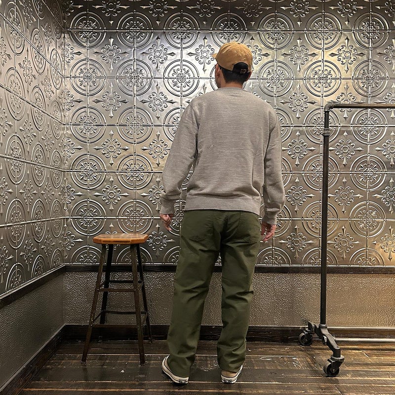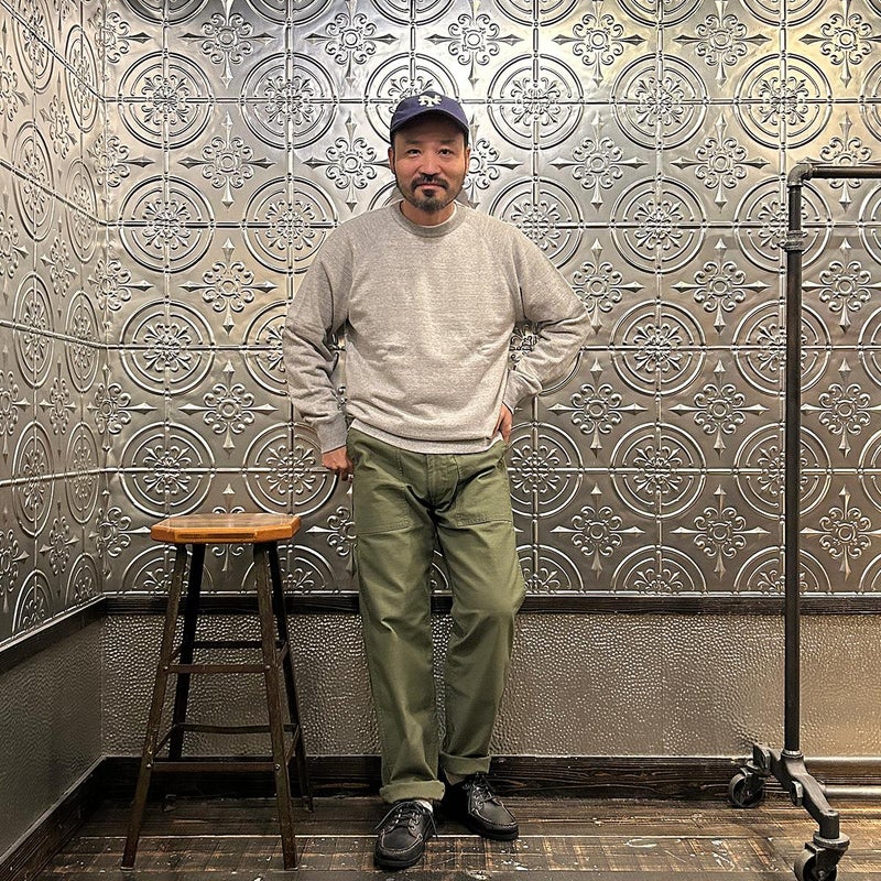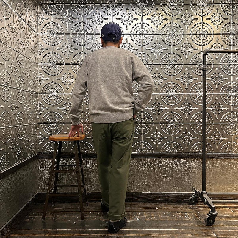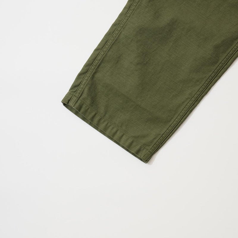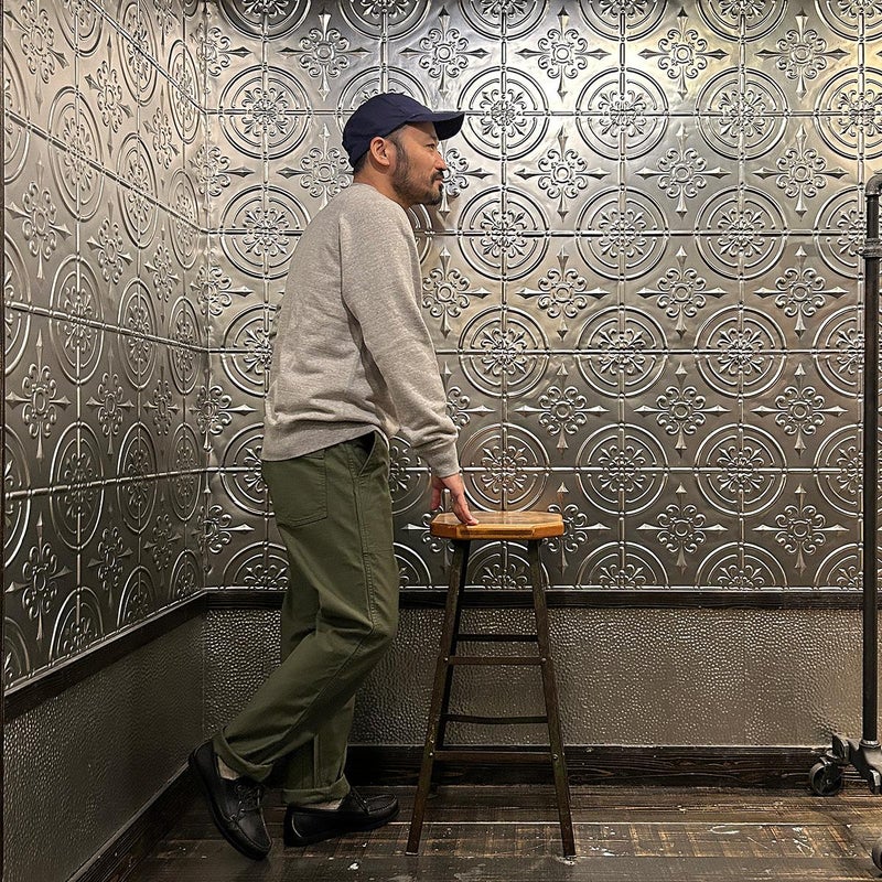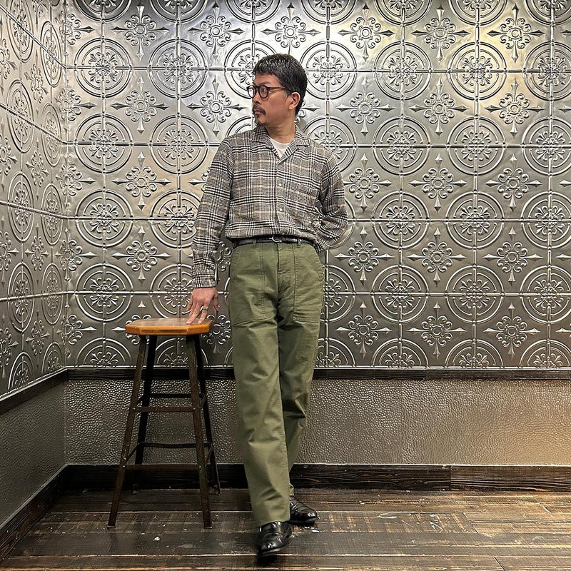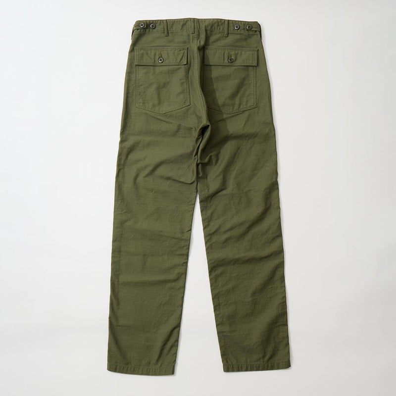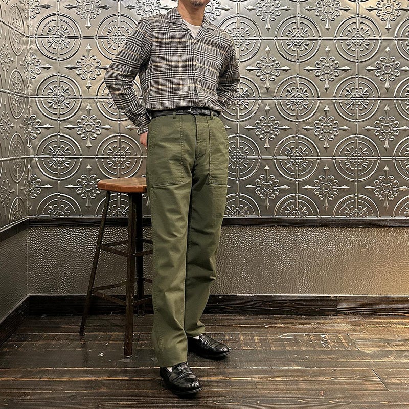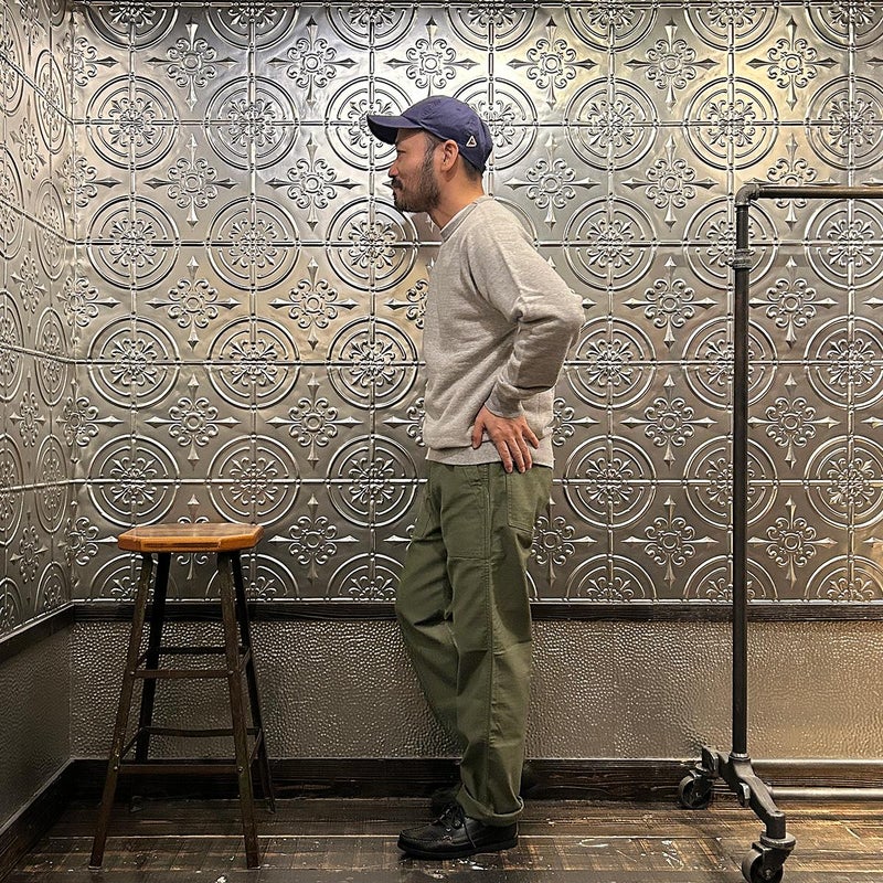 EMPIRE&SONS(エンパイアアンドサンズ)のFATIGUE PANT MILITARY SLUB BACK SATEEN。バックサテン生地をを使用したファティーグパンツ。ジップフロント仕様。フロントの大きなパッチポケットが特徴的なディテール。バックも大きめフラップポケットを装備。腰回りはややゆったり目、裾に向かって緩やかにテーパードされた綺麗なシルエット。1950-70年代、アメリカ軍のファティーグパンツに採用されえていた生地をイメージして作られたバックサテン生地。スラブ感の強い生地でエイジングも楽しみな1本。