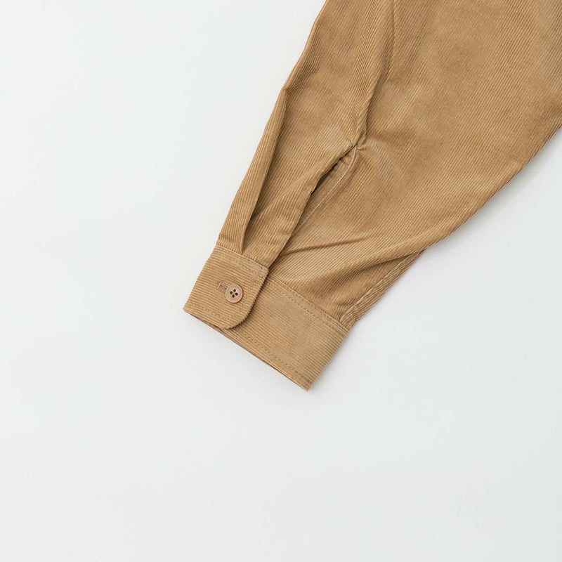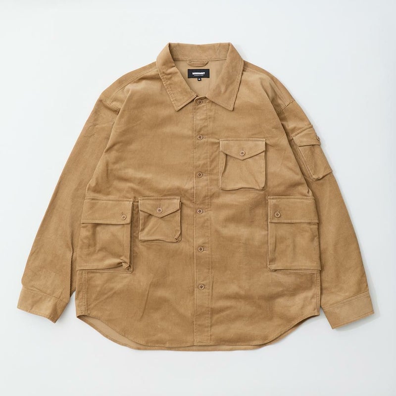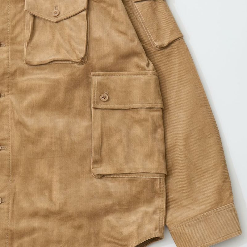 MODMNT(モドメント)のCORDUROY UTILITY CPO SHIRT。軍用のCPOシャツジャケットがデザインソースのジャケット。首元のチンストラップ。前身頃や後見頃、袖にランダムに配置された多数のポケット。前立てはボタンフライ。袖口はカフ仕様。素材は14Wの保温性に優れたコットンコーデュロイ。スタイリングに季節感を作ってくれる1着。