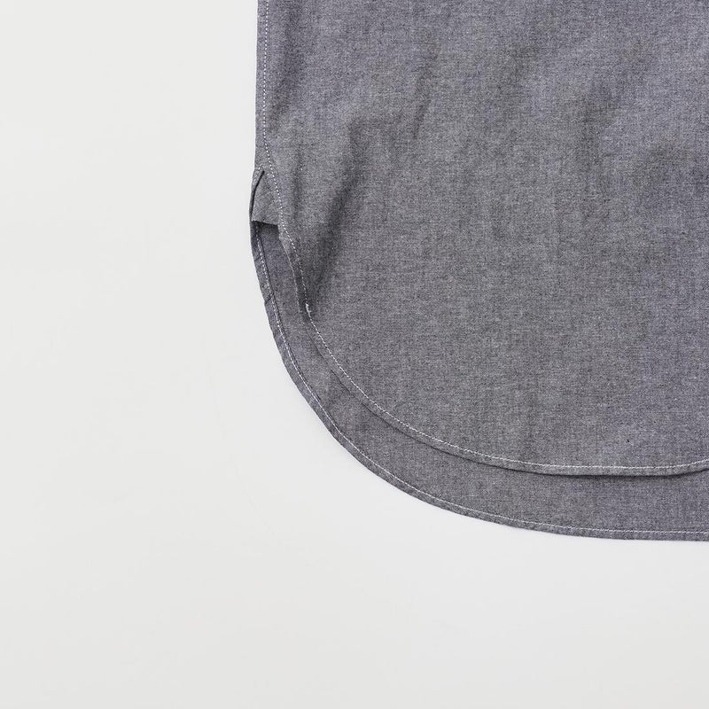 ENGINEERED GARMENTSの19 CENTURY BD SHIRT COTTON CHAMBRAY。プルオーバー風の前立て。重なり合うようにラウンドした裾のデザイン。深く取られたサイドスリットやマチ。現代では珍しい特徴的なディテールが多数取り入れられたボタンダウンシャツ。縫製は手間と時間のかかるシングルニードルで行われており、縫い目の美しさと高い耐久性を兼ね備えた仕上がり。素材は経年変化が楽しみなコットンシャンブレーを使用した1着。