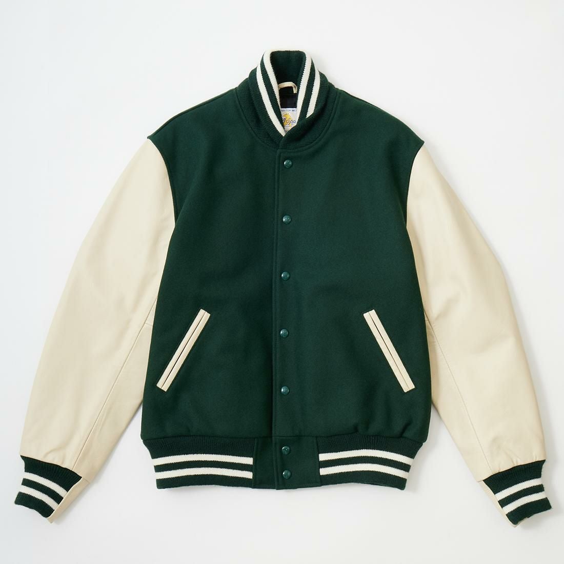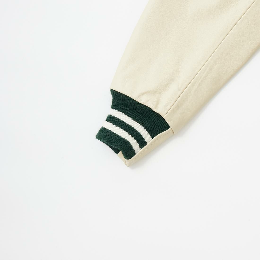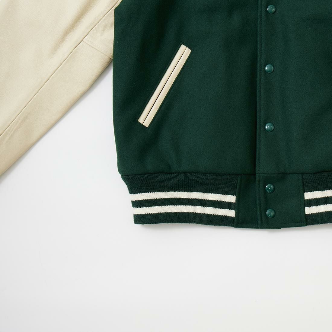 GB SPORTS (ジービースポーツ) THE ALBANY - CLASSIC FIT SNAP FRONT WOOL LEATHER VARSITY JACKET QUILT LINING - FOREST MELTON_CREAM COW LEATHER