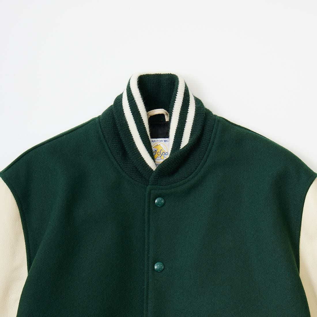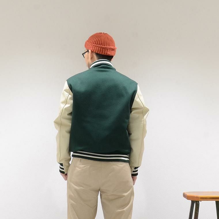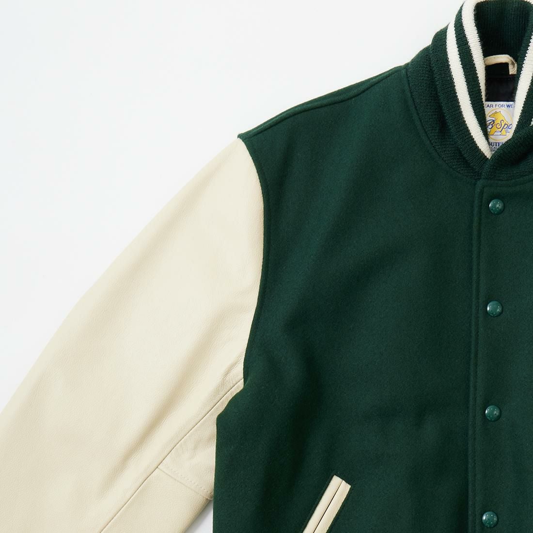 GB SPORTS (ジービースポーツ) THE ALBANY - CLASSIC FIT SNAP FRONT WOOL LEATHER VARSITY JACKET QUILT LINING - FOREST MELTON_CREAM COW LEATHER
