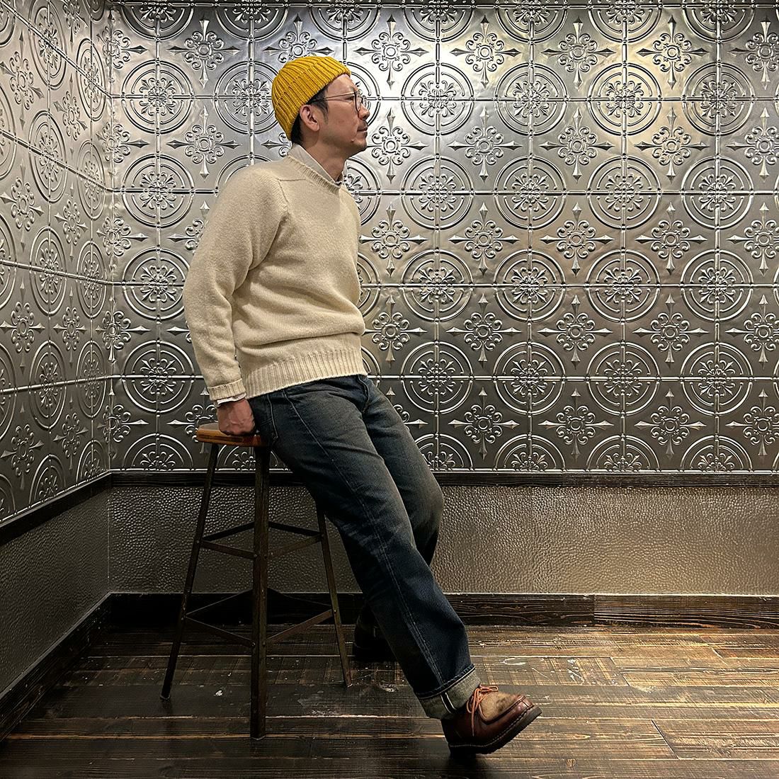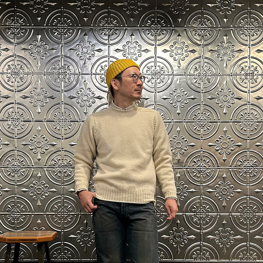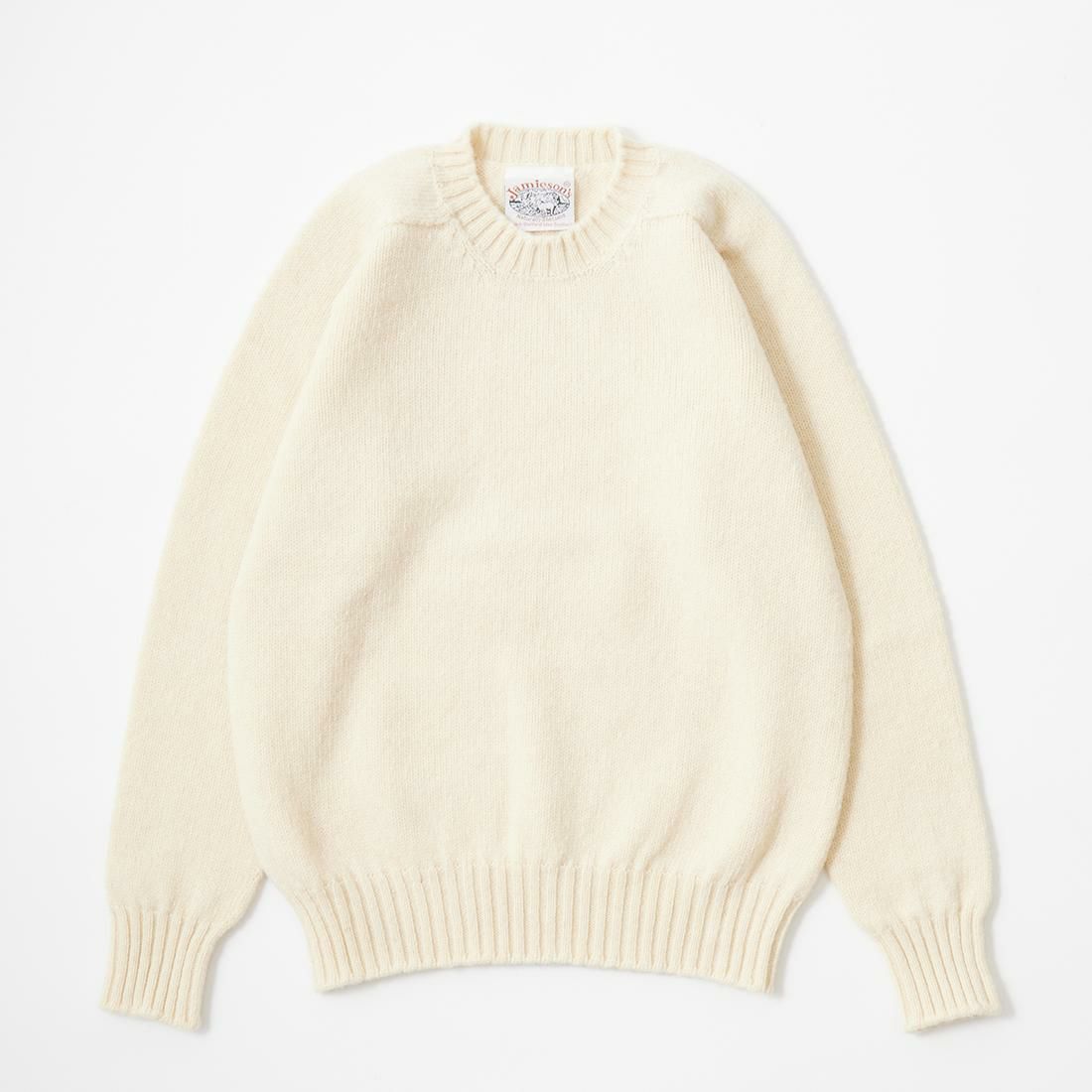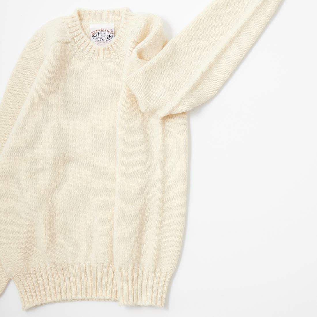 他の画像を見る サドルショルダー クルーネック ニット スコットランド製 JAMIESON'S (ジャミーソンズ) 3PLY PLAIN SADDLE SHOULDER CREW NECK WHOLE GARMENTS - 104 NAT.WHITE 販売価格 ¥ 27,500 税込 お気に入りに登録する